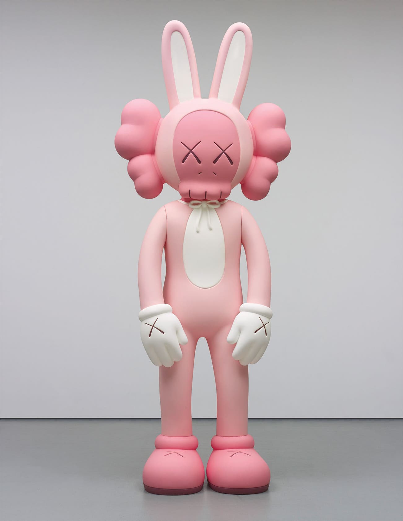 KAWS’ refined graphic language is the result of a meticulous process wherein he first hand draws his figures, editing them digitally in Illustrator, before eventually painting them from a projection, eventually adding his signature ‘X’ eyes. Sculptures like Accomplice require a more difficult process, as the artist must translate his vision in the round, working in 3D modelling software. When blown up to a life-sized scale, the present lot playfully draws a connection to the art historical tradition of figurative sculpture, beginning with Egyptian sarcophagi. The resulting sculpture is an adult-sized toy, injecting humour into more mature notions of life and death.