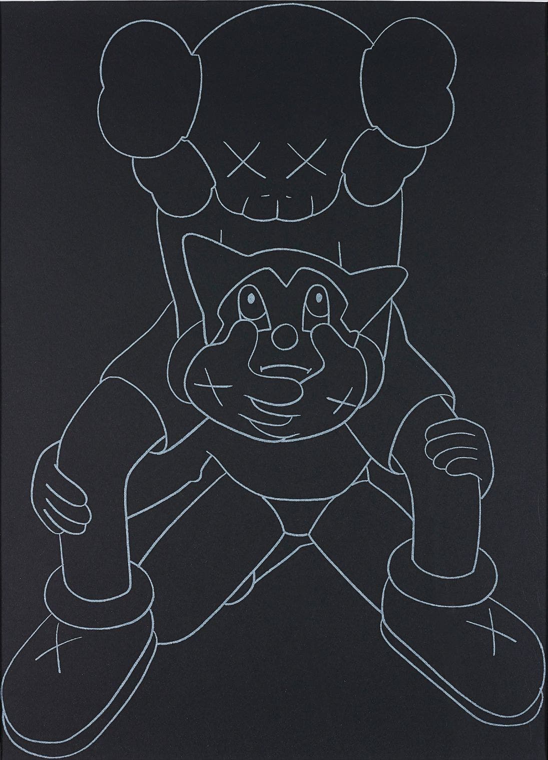 Perhaps he is most known for his larger-than-life fiberglass sculptures that supplant the body of Mickey Mouse onto KAWS' own imagined creatures, often with 'x'-ed out eyes or ultra-animated features. However, KAWS also works frequently in neon and vivid paint, adding animation and depth to contemporary paintings filled with approachable imagination. There is mass appeal to KAWS, who exhibits globally and most frequently in Asia, Europe and the United States.