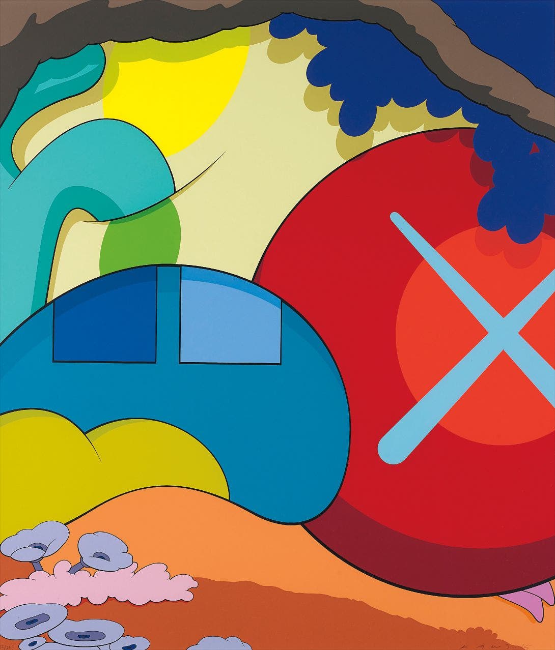 Perhaps he is most known for his larger-than-life fiberglass sculptures that supplant the body of Mickey Mouse onto KAWS' own imagined creatures, often with 'x'-ed out eyes or ultra-animated features. However, KAWS also works frequently in neon and vivid paint, adding animation and depth to contemporary paintings filled with approachable imagination. There is mass appeal to KAWS, who exhibits globally and most frequently in Asia, Europe and the United States.