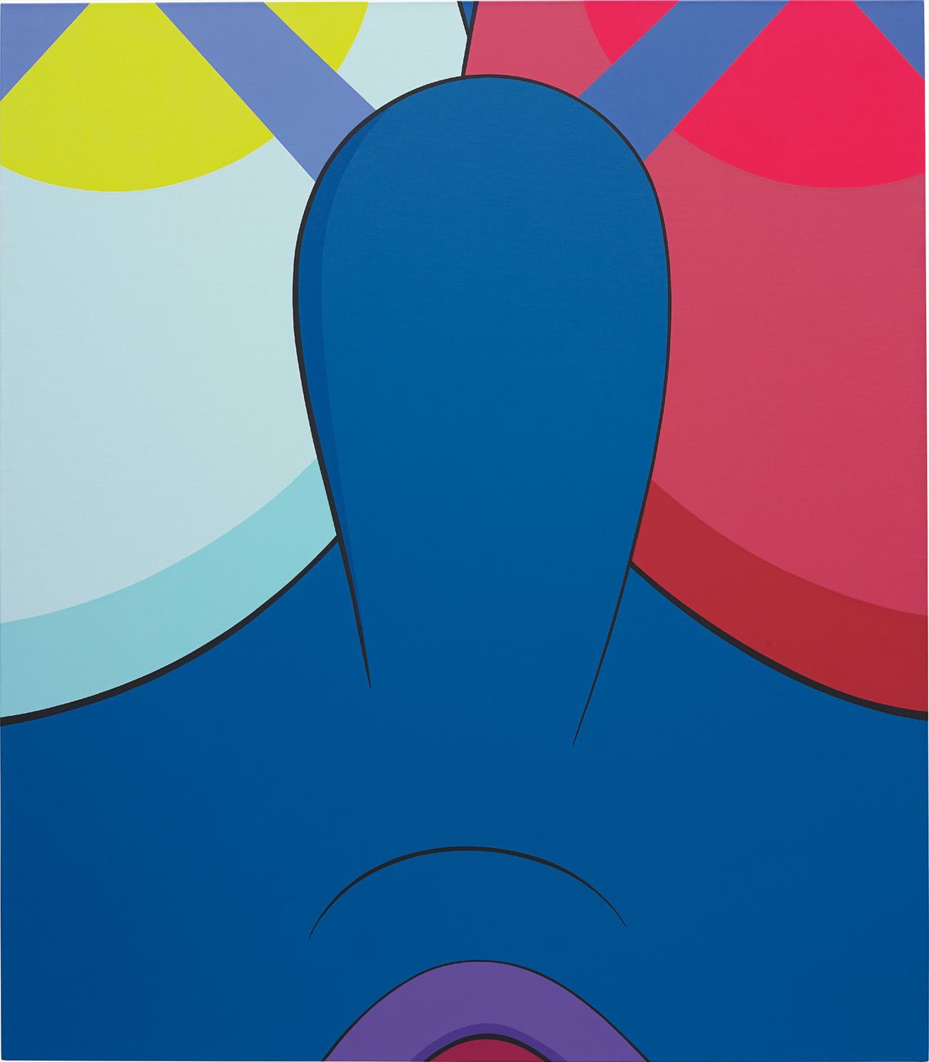 The sinister motif of the X adopted by KAWS allows each of his cartoon characters to undergo a sardonic mutation. His use of acrylic paint can be traced back to his beginnings in animation for Jumbo Pictures and painting the scenes for the live-action 101 Dalmations in 1996. In the present lot, SpongeBob’s iconic yellow has been traded for a bright indigo blue, with purple lips and contrasting neon eyes, yet he is still familiar to a media-savvy audience. Of his propensity to represent SpongeBob, who appears throughout his works, KAWS has explained, “I started doing SpongeBob paintings for Pharrell. Then I started doing smaller paintings, which got much more abstract. And SpongeBob was something I wanted to do because graphically I love the shapes. But honestly, when I’m painting SpongeBob, I’m not thinking, Oh, I loved this episode. Honestly, I’ve never even watched it” (T. Maguire, “KAWS,” Interview, May 2010). The cleverly-named KAWSBOB series, of which the present lot is quintessential, continues to challenge our perceptions about how artists and their avenues of production can both represent the effects of mass media and still turn it on its own head.