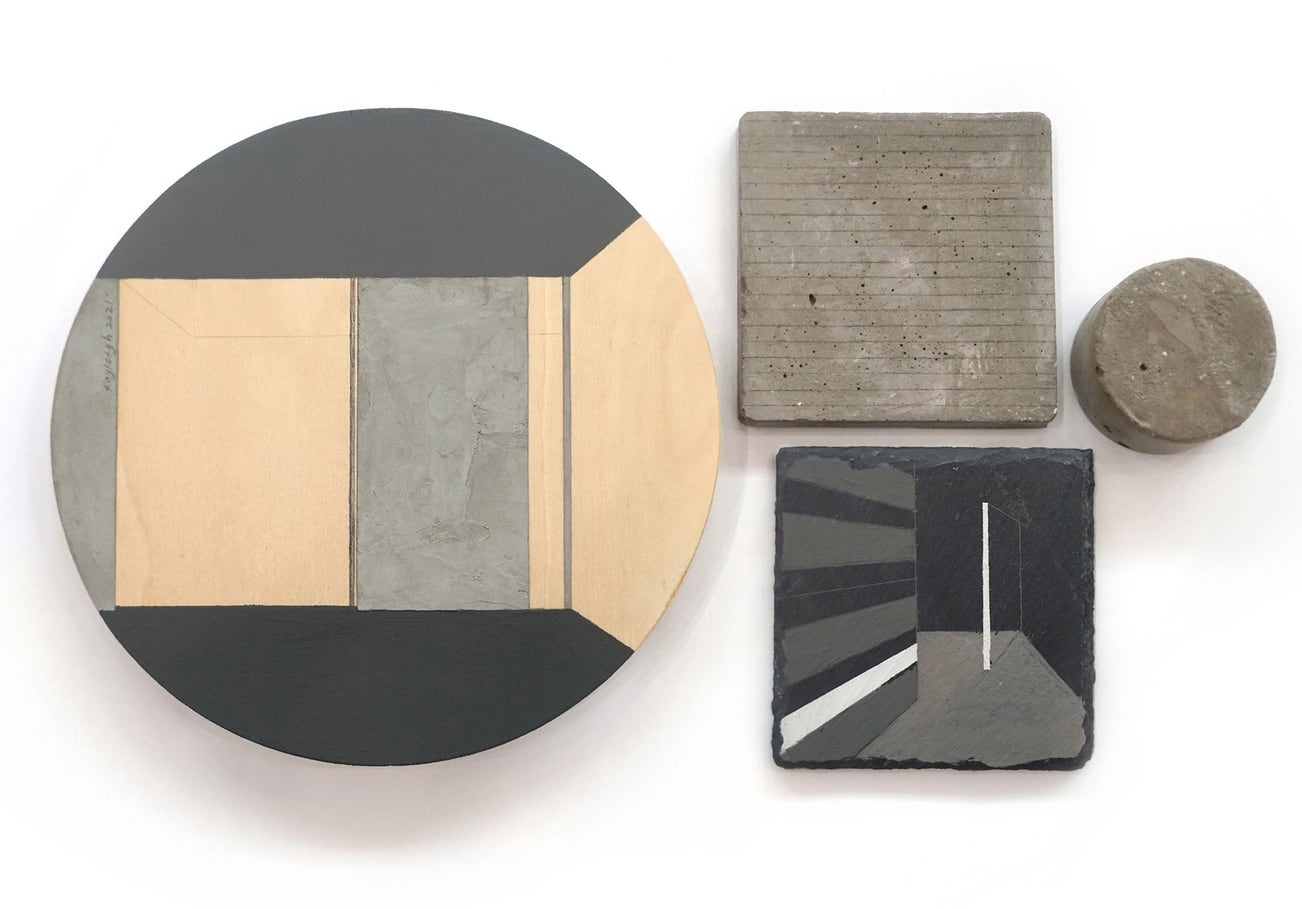 Kayleigh Goh (b. 1993, Malaysia) is inspired by new materialism, a field of inquiry that encourages a less human-dominated perspective of reality. It embraces non-human voices, drawing on materials and their interconnectedness to the world. Part of a City Orchestra Assemblage captures intimate encounters with places and objects, portraying a fragment of a city in four parts: the corner of a room painted on in a circular wooden plane; a small, square slate rock plate depicting two panels floating in a dark space; and two rugged cement pieces seemingly plucked out of a road’s pavement. The four objects, painted with bare detail, spotlight the most mundane parts of a city. Rather than focusing on grand, busy landscapes, Part of a City Orchestra Assemblage invites viewers to find poetry in monochrome grey colours, subtle textures of wood and cement and overlooked spaces, shadows and corners, which together form the mood and character of a city.