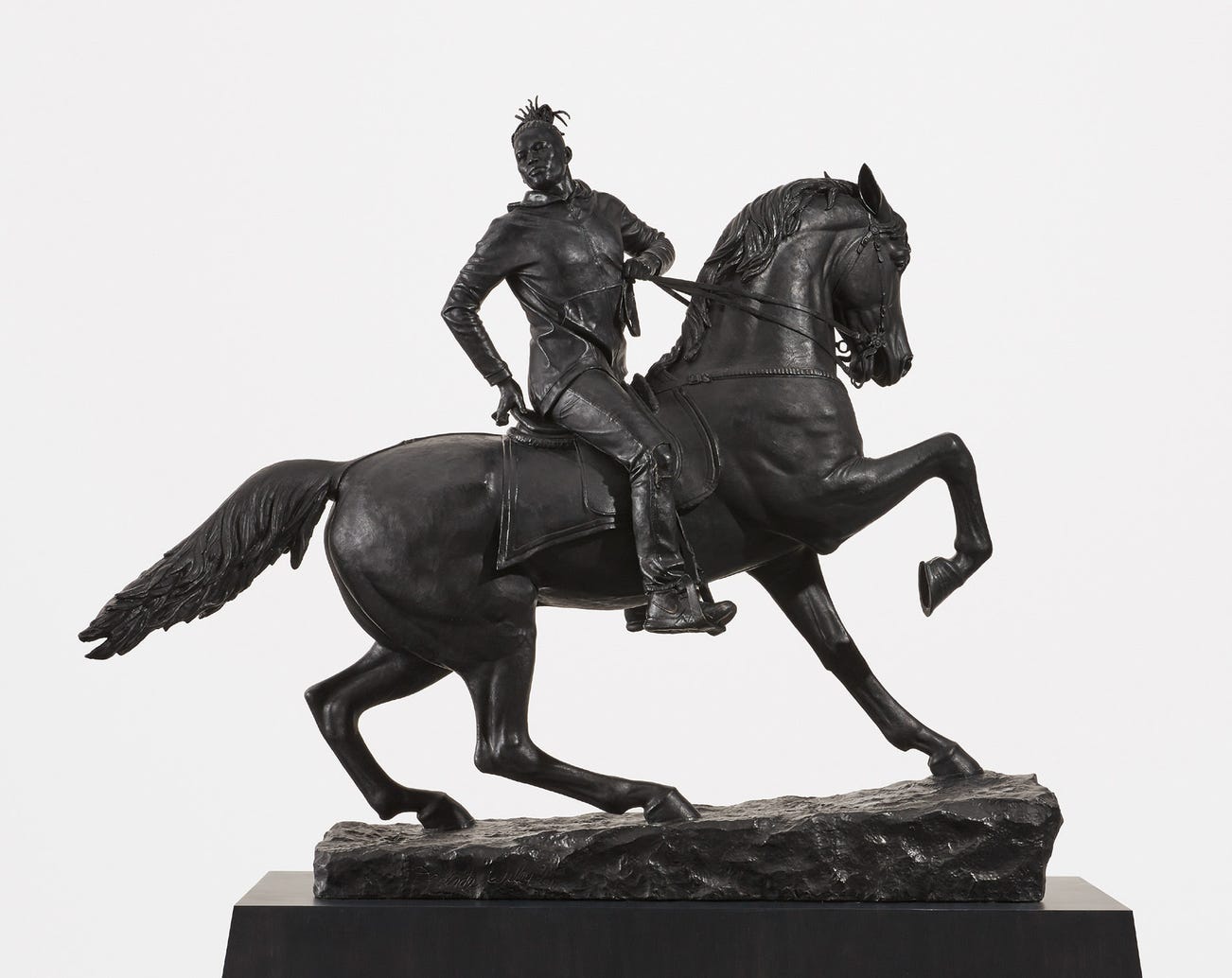 incised with the artist's signature, number and date "Kehinde Wiley 2019 3/9" along the lower front edge of the sculpture; incised with the artist's initials "KW" on the horse's bridle