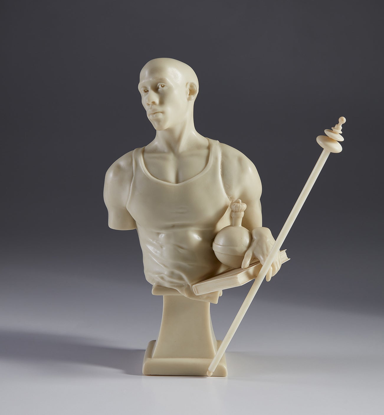 The Neoclassical bust, St. Francis of Adelaide, was influenced by Jean-Auguste-Dominique Ingre’s stained glass window, St. Francis of Ad- elaide in Paris at The Chapel of Saint Ferdinand. The strong, proud, athletic young man is dressed in street attire and holding a symbolic book and scep- ter. He appears as a learned monarch. His soul searching contemplative eyes have the feeling of Cezanne’s “Still Life with Skull” or Rogier van der Weyden “Portrait of a Man Holding a Book.” The composition is familiar but the influences are beyond easy recognition. The philosopher appears as a hero in pursuit of revealing the universal truth in the 21st Century.