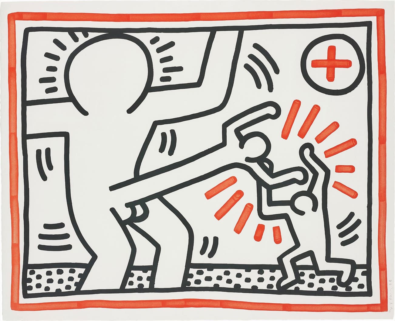 Throughout his tragically brief career, Haring refined a visual language of symbols, which he called icons, the origins of which began with his trademark linear style scrawled in white chalk on the black unused advertising spaces in subway stations. Haring developed and disseminated these icons far and wide, in his vibrant and dynamic style, from public murals and paintings to t-shirts and Swatch watches. His art bridged high and low, erasing the distinctions between rarefied art, political activism and popular culture.