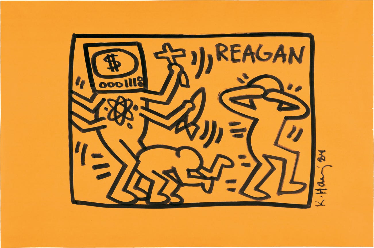 In response to this project, Haring created the present lot, illustrating a politically charged narrative. The leftmost figure represents Republican presidential candidate Ronald Reagan, or more symbolically, the Reagan administration; he is depicted with four outstretched arms and a television for a head, towering over a crouching figure in the center. The rightmost figure covers his eyes and appears to be running away in fear, resisting the notoriously effective television advertising from Reagan’s campaign, characterized by Haring’s chosen symbols of a money sign, crucifix and nuclear energy. To make clear this narrative, Haring uses text to spell out “REAGAN” in the upper right corner, perhaps inspired by Holzer’s use of text in many of her works, including Sign on a Truck. The scene is rendered in black ink atop a vividly fluorescent orange paper, enclosed in a hand-drawn smaller box, possibly meant to symbolize the mobile screen from Holzer’s project. As such, the present lot is a personal interpretation of Haring’s own reflection on a meaningful time in his career collaborating with Holzer, rendered in an aesthetic vibrancy that remains true to his unique visual practice.
