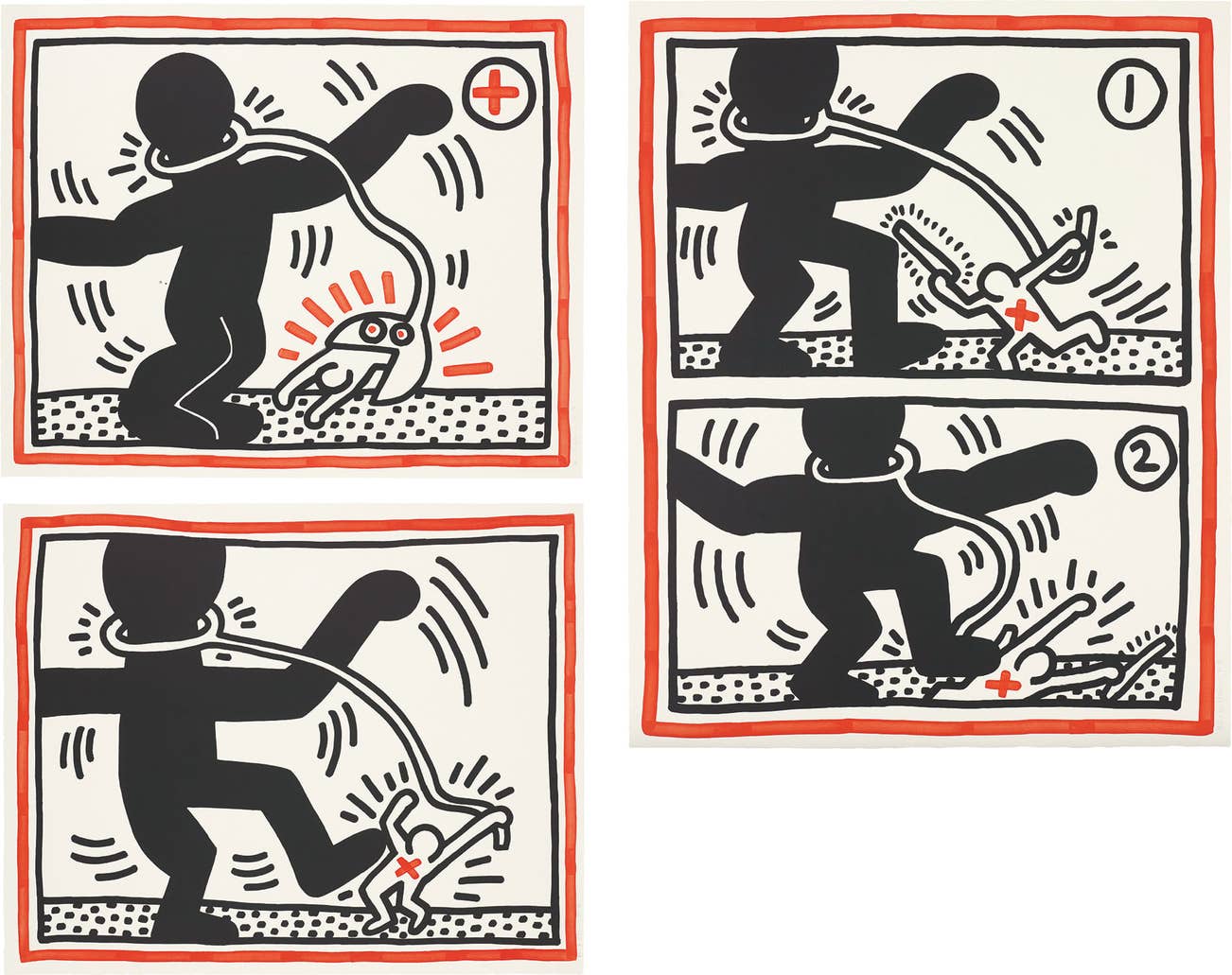 Throughout his tragically brief career, Haring refined a visual language of symbols, which he called icons, the origins of which began with his trademark linear style scrawled in white chalk on the black unused advertising spaces in subway stations. Haring developed and disseminated these icons far and wide, in his vibrant and dynamic style, from public murals and paintings to t-shirts and Swatch watches. His art bridged high and low, erasing the distinctions between rarefied art, political activism and popular culture.