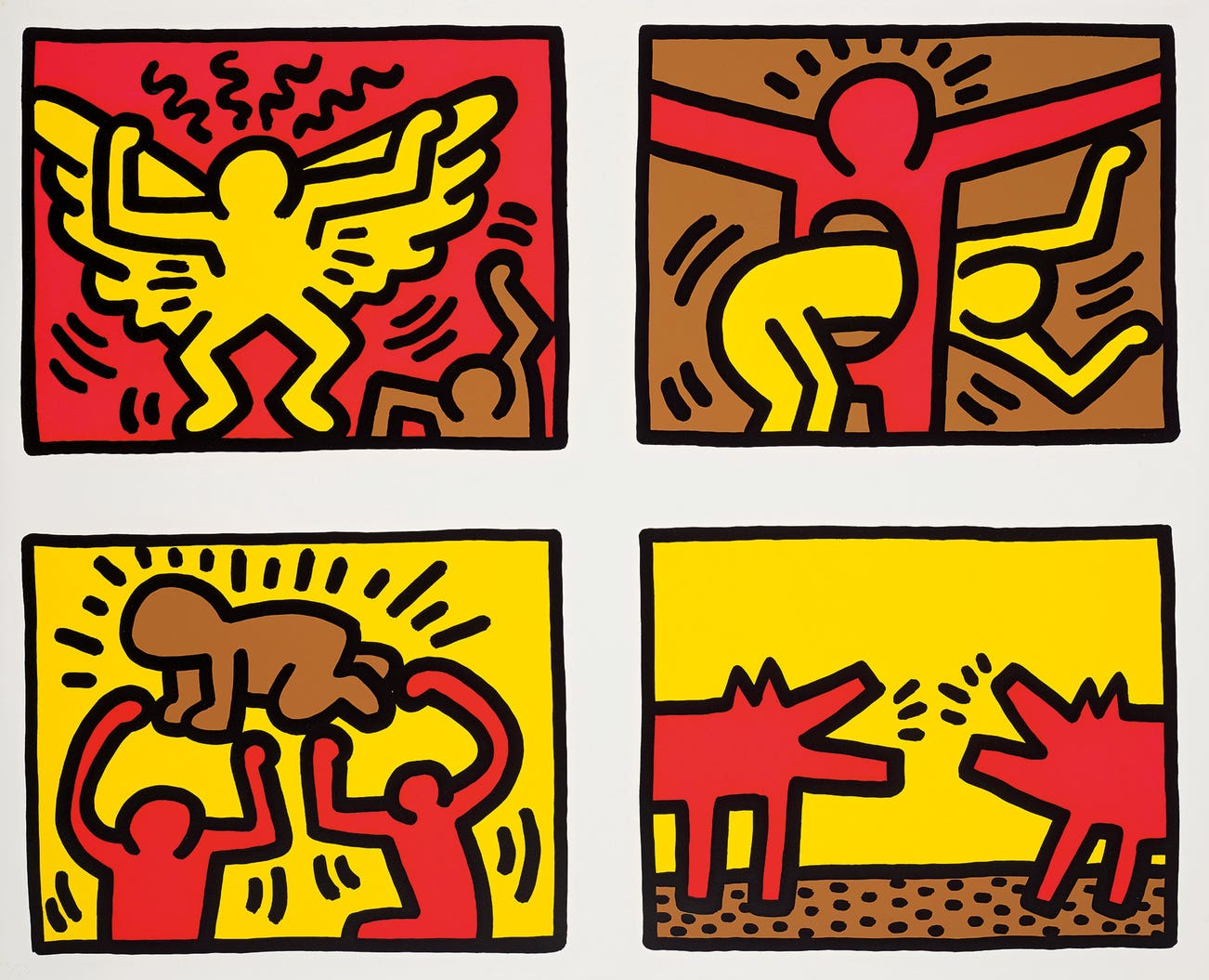 Throughout his tragically brief career, Haring refined a visual language of symbols, which he called icons, the origins of which began with his trademark linear style scrawled in white chalk on the black unused advertising spaces in subway stations. Haring developed and disseminated these icons far and wide, in his vibrant and dynamic style, from public murals and paintings to t-shirts and Swatch watches. His art bridged high and low, erasing the distinctions between rarefied art, political activism and popular culture.