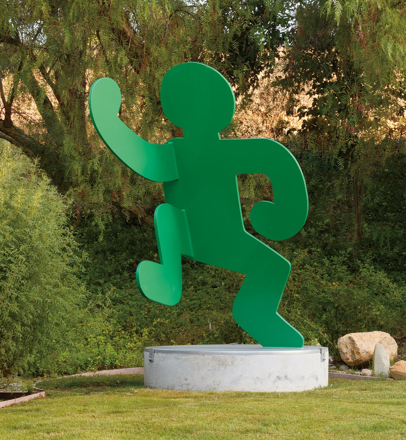 Soaring nearly eight feet high and frozen in ecstatic dance, Keith Haring’s Untitled (Self Portrait), 1989, offers a jubilant celebration of life. Transposing his iconic ideogram into three-dimensional form, Haring here exhibits his mastery of the sculptural medium within a period of just four years. It was at Tony Shafrazi’s suggestion that Haring ventured into the sculptural medium, taking his distinctive graphic form into the third dimension. As David Galloway has observed, Haring’s sculptures, “like virtually every other aspect of his comet-like career…reveal a formal evolution of break-dance speed” (David Galloway, Keith Haring, Sculptures, Painting and Works on Paper, exh. cat., Ben Brown Fine Arts, London, 2005, p. 21). Freely sculpting models from cardboard with a pair of scissors, Haring embraced an intuitive and self-assured hands-on approach to creating sculpture. After presenting his first free-standing sculptures at Leo Castelli Gallery, New York, in 1985, Haring agreed to collaborate with the Hans Mayer Gallery in Dusseldorf to produce his so-called Dusseldorf Sculptures, which were notably exhibited at Münster’s Skulpturen Projekte in 1987 along with the works of such stalwarts as Richard Serra and Sol Lewitt.