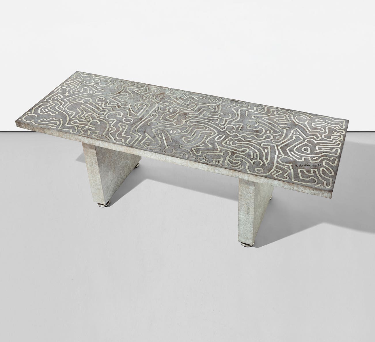 incised with the artist's signature and date "K. Haring 90 ⨁" lower right of the table surface; stamped with the number and the foundry mark "2/9" upper right of the table surface
