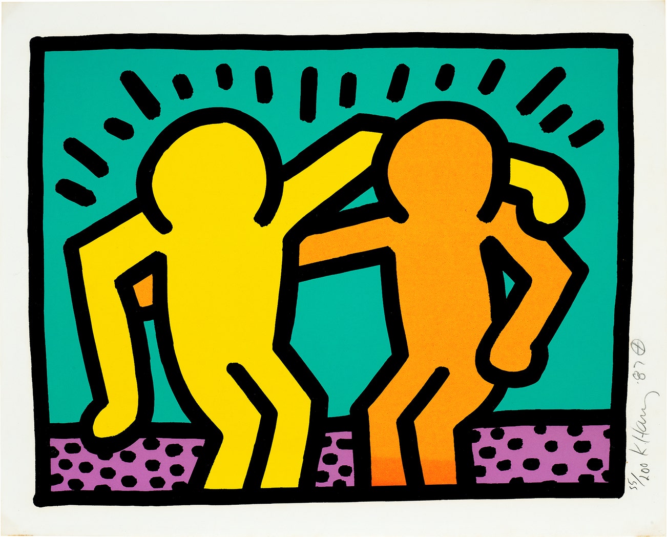 American | B. 1958 D. 1990Haring's art and life typified youthful exuberance and fearlessness. While seemingly playful and transparent, Haring dealt with weighty subjects such as death, sex and war, enabling subtle and multiple interpretations.