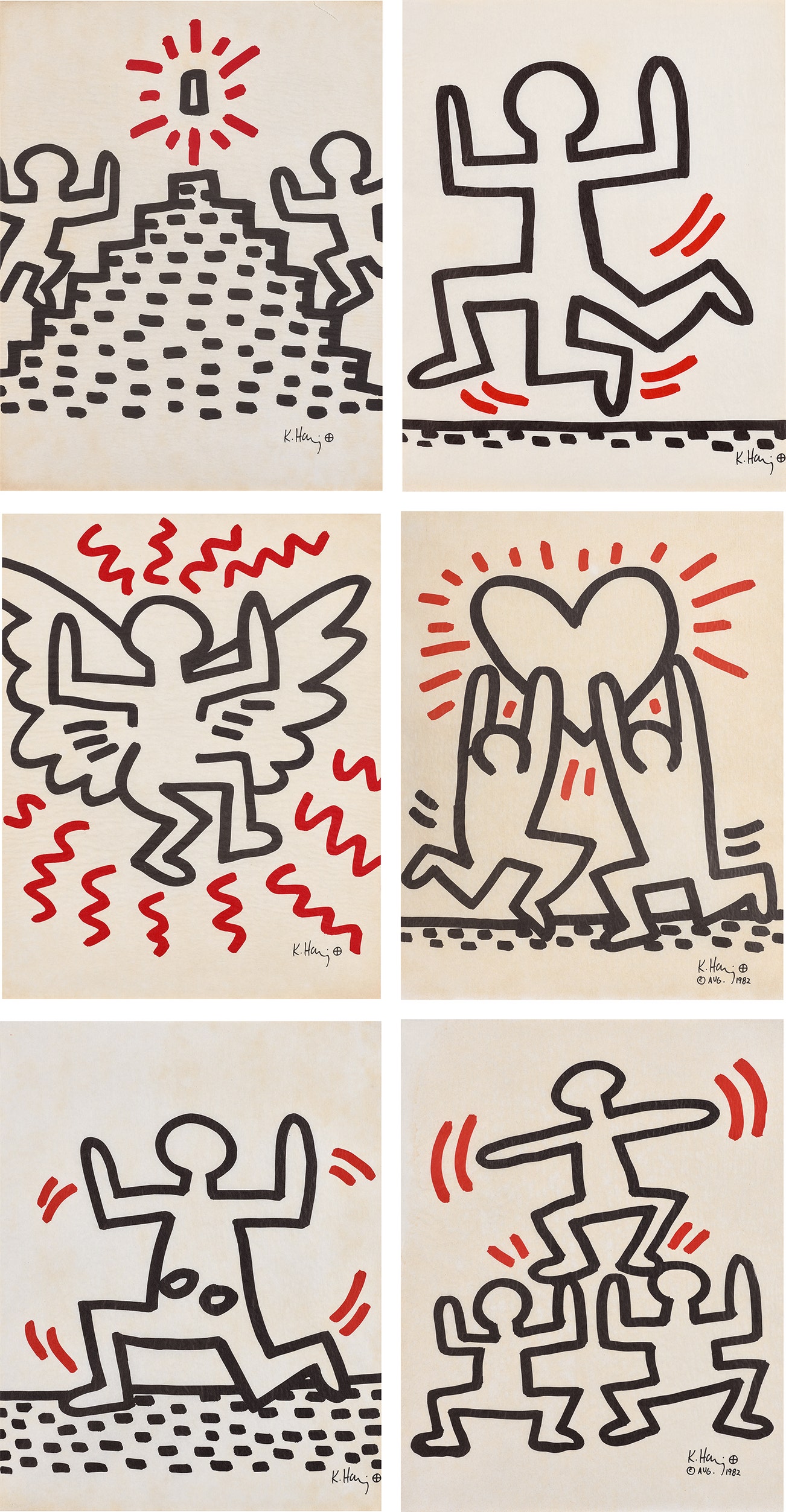 Throughout his tragically brief career, Haring refined a visual language of symbols, which he called icons, the origins of which began with his trademark linear style scrawled in white chalk on the black unused advertising spaces in subway stations. Haring developed and disseminated these icons far and wide, in his vibrant and dynamic style, from public murals and paintings to t-shirts and Swatch watches. His art bridged high and low, erasing the distinctions between rarefied art, political activism and popular culture.