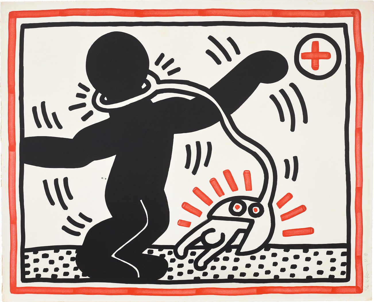 Throughout his tragically brief career, Haring refined a visual language of symbols, which he called icons, the origins of which began with his trademark linear style scrawled in white chalk on the black unused advertising spaces in subway stations. Haring developed and disseminated these icons far and wide, in his vibrant and dynamic style, from public murals and paintings to t-shirts and Swatch watches. His art bridged high and low, erasing the distinctions between rarefied art, political activism and popular culture.