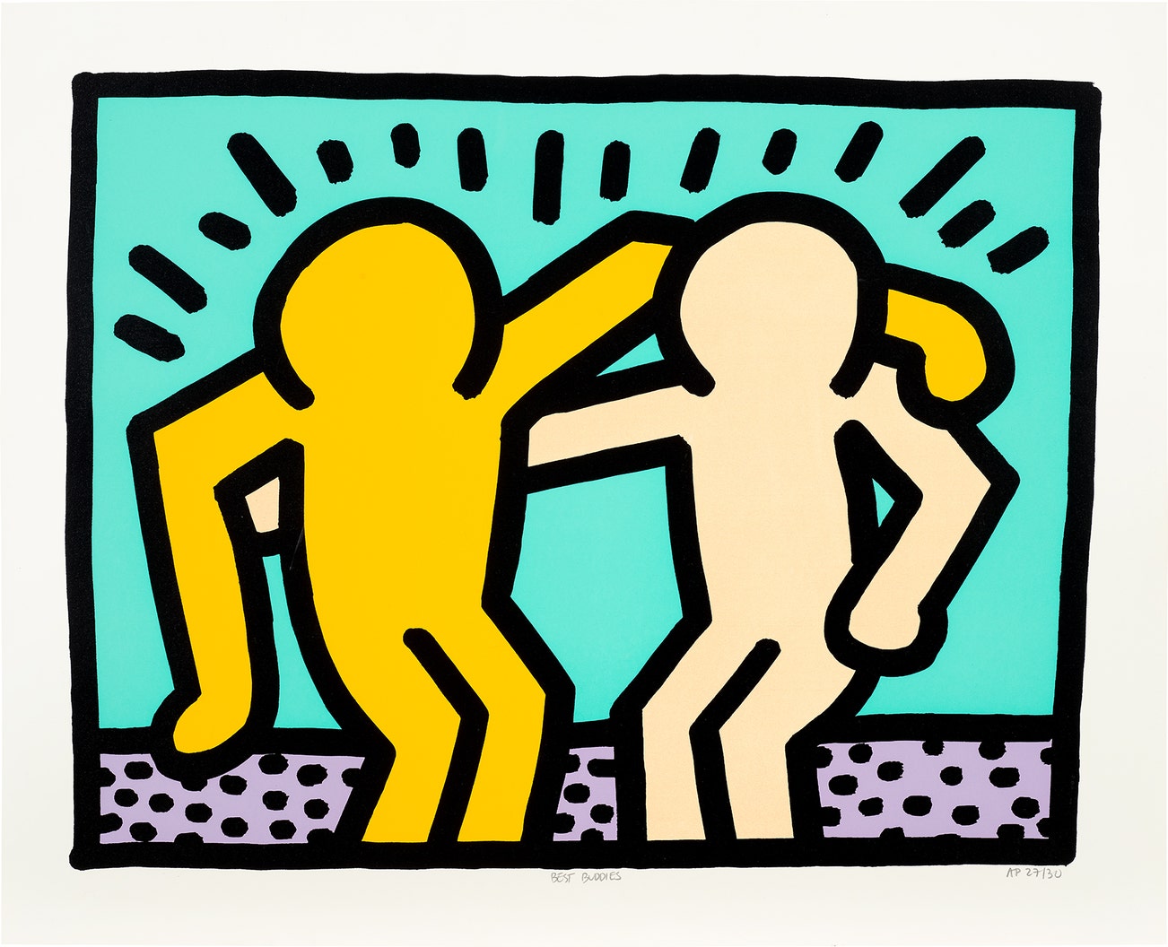 Titled and numbered 'AP 27/30' in pencil on the front (an artist's proof, the edition was 200), signed and dated '4/25/90' by Julia Gruen (Executor for the Keith Haring Estate) in pencil on the Estate stamp on the reverse, also signed by the printer, and Anthony Shriver, founder of the Best Buddies organisation, unframed.