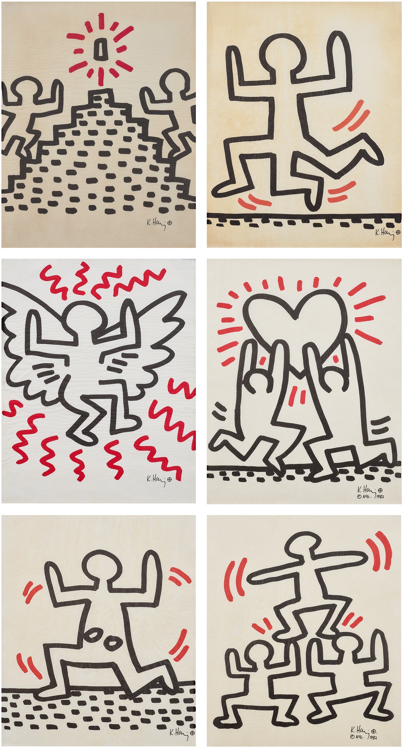 Throughout his tragically brief career, Haring refined a visual language of symbols, which he called icons, the origins of which began with his trademark linear style scrawled in white chalk on the black unused advertising spaces in subway stations. Haring developed and disseminated these icons far and wide, in his vibrant and dynamic style, from public murals and paintings to t-shirts and Swatch watches. His art bridged high and low, erasing the distinctions between rarefied art, political activism and popular culture.