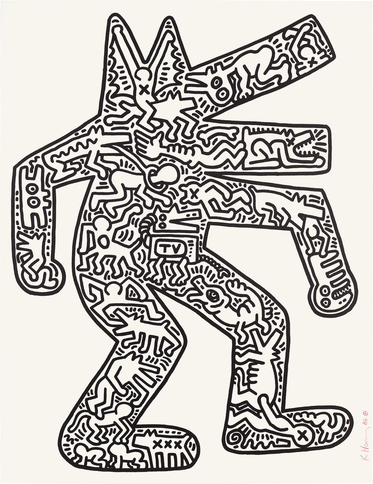 American | B. 1958 D. 1990Haring's art and life typified youthful exuberance and fearlessness. While seemingly playful and transparent, Haring dealt with weighty subjects such as death, sex and war, enabling subtle and multiple interpretations.