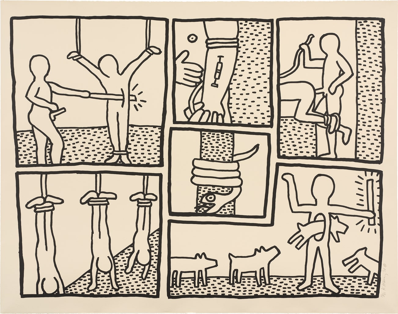 American | B. 1958 D. 1990Haring's art and life typified youthful exuberance and fearlessness. While seemingly playful and transparent, Haring dealt with weighty subjects such as death, sex and war, enabling subtle and multiple interpretations.