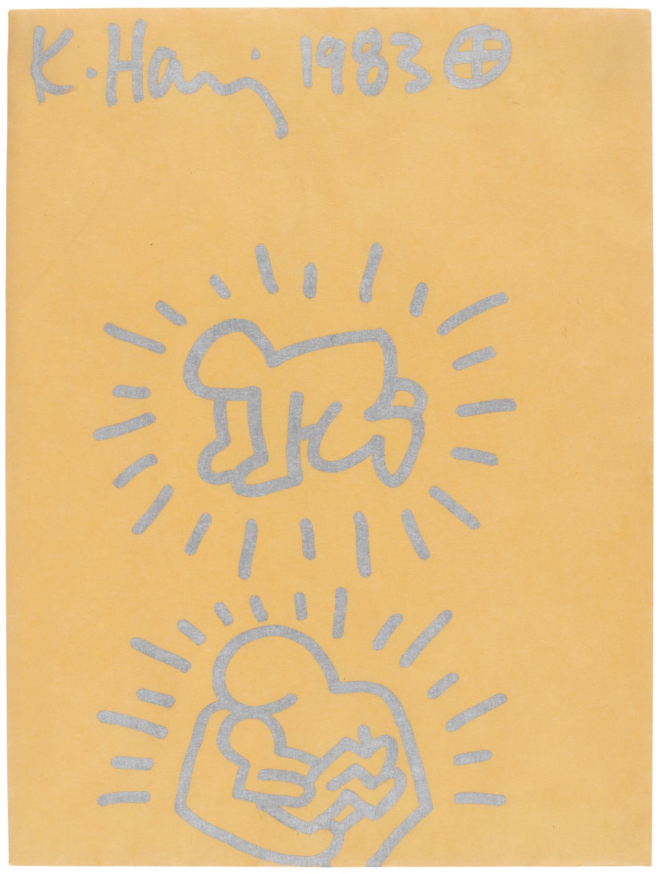 Signed and dated in silver ink, with the artist's name, studio and home phone numbers inscribed in black ink on the reverse, and with a Pop Shop sticker affixed to the reverse, accompanied by a Certificate of Authenticity issued by The Estate of Keith Haring and signed by Julia Gruen, Executor of the Estate, framed.