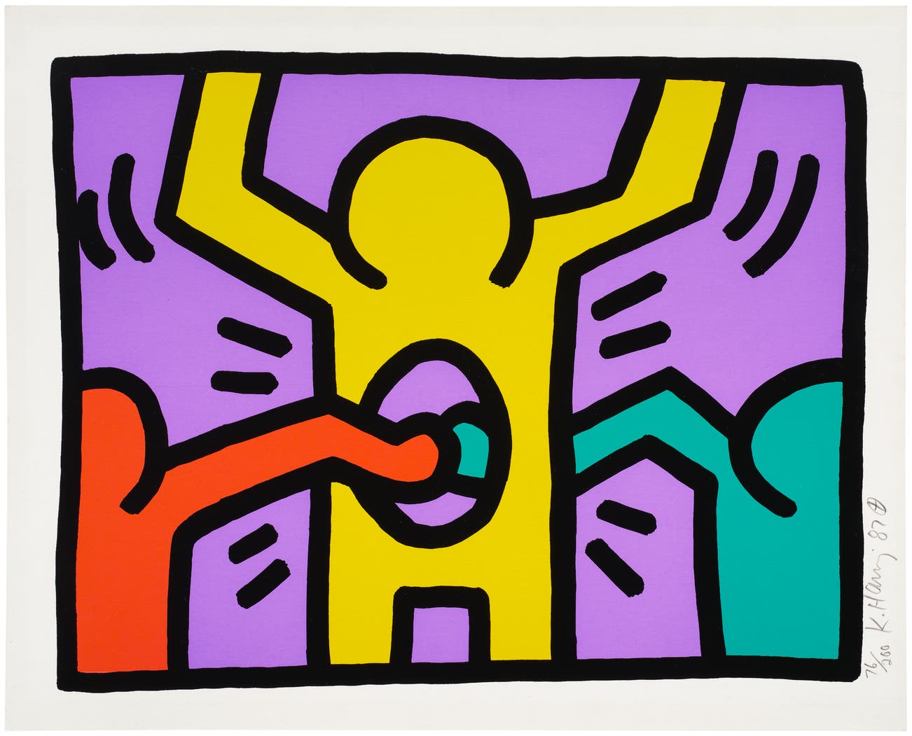 Throughout his tragically brief career, Haring refined a visual language of symbols, which he called icons, the origins of which began with his trademark linear style scrawled in white chalk on the black unused advertising spaces in subway stations. Haring developed and disseminated these icons far and wide, in his vibrant and dynamic style, from public murals and paintings to t-shirts and Swatch watches. His art bridged high and low, erasing the distinctions between rarefied art, political activism and popular culture.