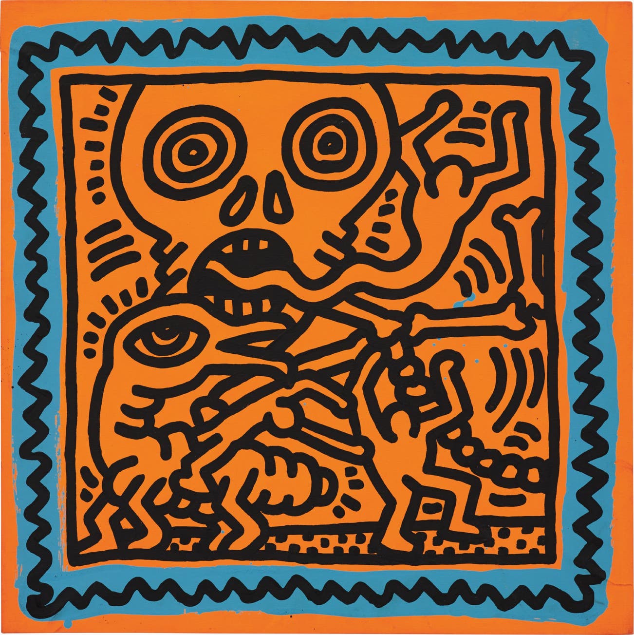 Untitled (1984) features a garish skull consuming or regurgitating a ghoul which lashes its arms out in defence, while figures in the foreground attempt to escape a strangely phallic hybrid form that keeps a watchful eye over all their movements. Dismembered bones can be seen spilling out of the canvas emphasising the ominous qualities of the scene unfolding before us. Rendered in 1984, this work was produced during Haring’s period of exploration into hellish motifs not dissimilar to that of Francisco Goya or Hieronymus Bosch. Goya’s renowned series of Black Paintings centred on haunting themes displayed his own fear of insanity as well as his depressing view of humanity; from this collection of fourteen works one of the most resoundingly powerful images that arose was that of Saturn devouring his son. Therefore, perhaps Haring’s deathly head in the top left section of Untitled harks back to this motif. Similarly, something of Bosch’s surreal visions of hell can be found in the manner in which Haring morphs animalistic characteristics with cleverly jarring motifs to form his inventive range of monsters that inhabit the works of this period. Specifically, the four-legged creature in the bottom left corner of this composition echoes Bosch’s Prince of Hell with its beaked, bird-like head and large all-seeing eye.