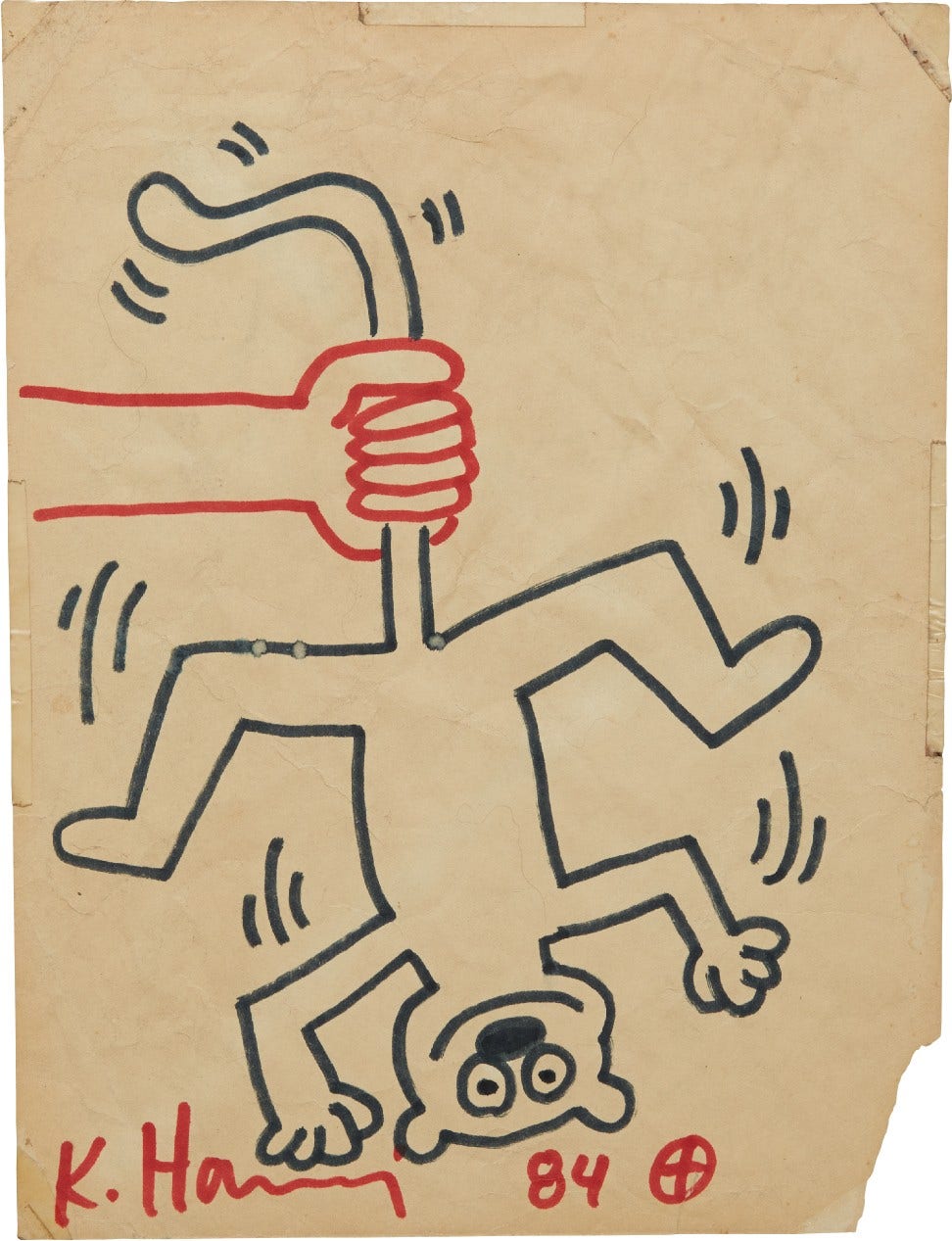 Throughout his tragically brief career, Haring refined a visual language of symbols, which he called icons, the origins of which began with his trademark linear style scrawled in white chalk on the black unused advertising spaces in subway stations. Haring developed and disseminated these icons far and wide, in his vibrant and dynamic style, from public murals and paintings to t-shirts and Swatch watches. His art bridged high and low, erasing the distinctions between rarefied art, political activism and popular culture.