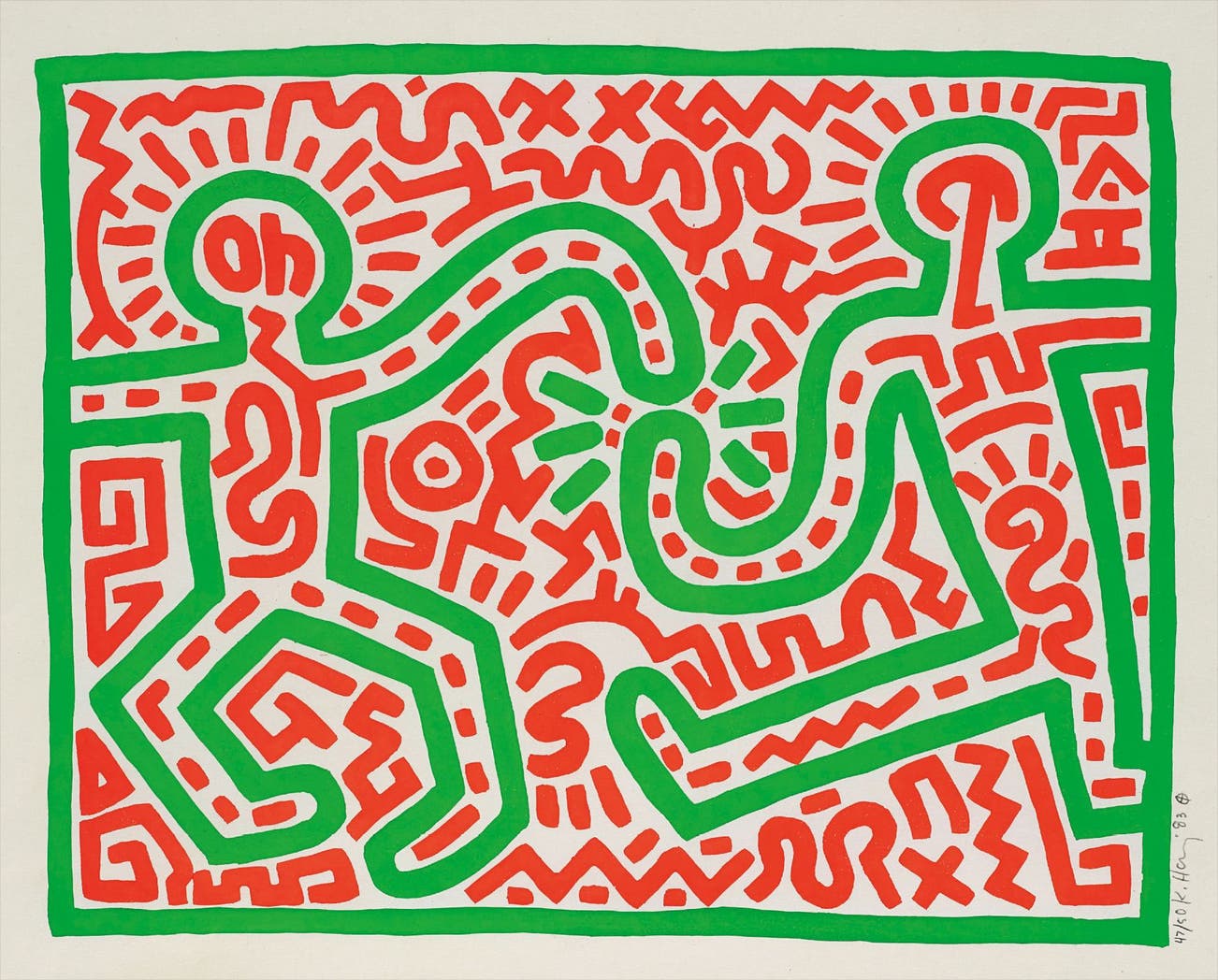 Throughout his tragically brief career, Haring refined a visual language of symbols, which he called icons, the origins of which began with his trademark linear style scrawled in white chalk on the black unused advertising spaces in subway stations. Haring developed and disseminated these icons far and wide, in his vibrant and dynamic style, from public murals and paintings to t-shirts and Swatch watches. His art bridged high and low, erasing the distinctions between rarefied art, political activism and popular culture.
