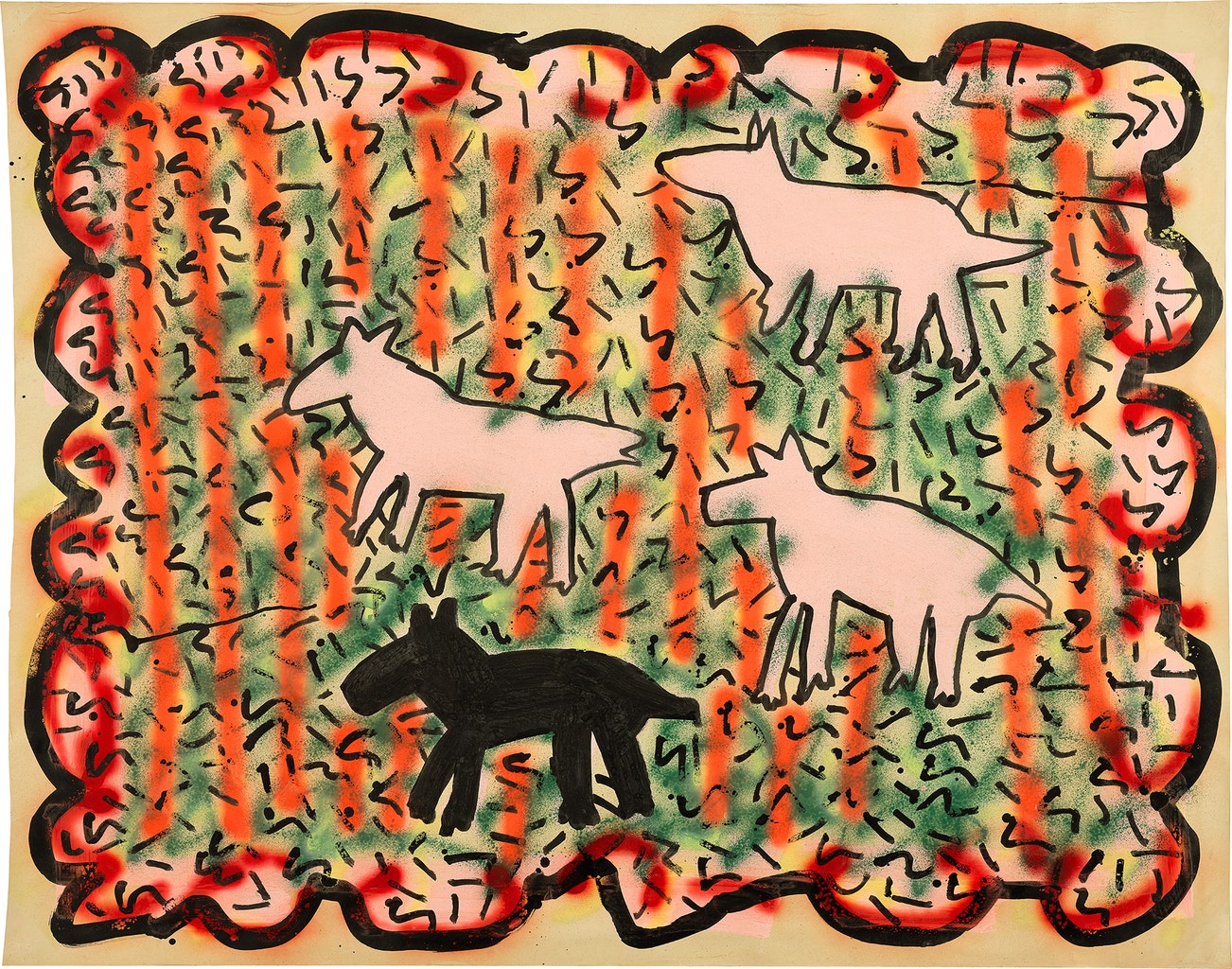 American | B. 1958 D. 1990Haring's art and life typified youthful exuberance and fearlessness. While seemingly playful and transparent, Haring dealt with weighty subjects such as death, sex and war, enabling subtle and multiple interpretations.