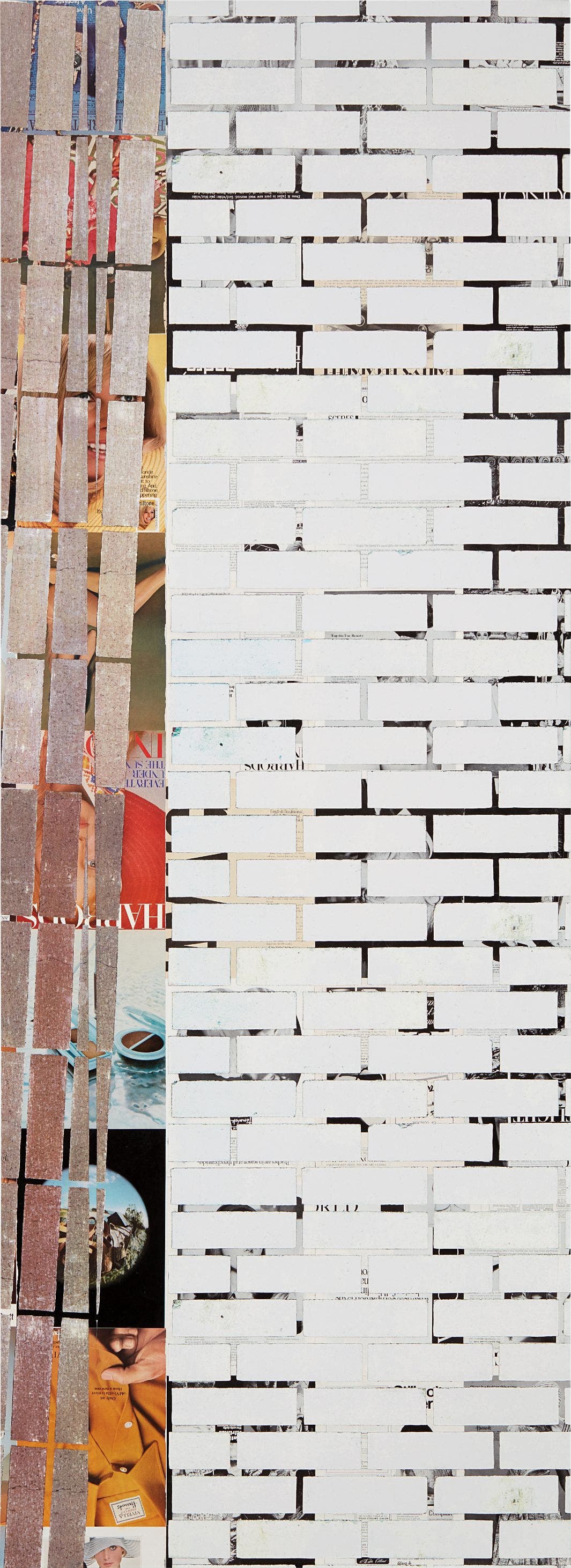 Appropriating material from the public domain is Kelley Walker’s expertise. Untitled consists of collaged magazine pages, covered with a horizontal pattern of white bricks. The painting is further disrupted by a vertical band with a diagonal stripe of grey bricks, resulting in a colossal flat structure that conveys a sense of three-dimensionality. Through the repurposing of printed iconic cultural images, Walker criticises the banality of information in Western society and denounces modern consumerism and the supreme force of advertising and media.