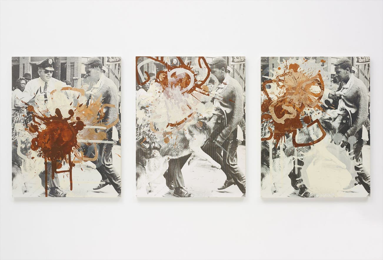 Incorporating images from advertising and mass-media into his oeuvre, artist Kelley Walker brings attention to the issues underlying the American psyche, namely: race, politics and consumerism. While Walker openly admits that he dislikes association with 'appropriation art,' it is difficult not to draw comparison with earlier Pop Art stalwarts like Andy Warhol. The present lot, a triptych entitled Black Star Press (Black Star, Black Press, Star Press), easily recalls Warhol’s Disaster series, particularly the images of race riots executed in the early 1960s. While Warhol created these paintings as a reaction to events as they were unfolding, Walker’s sensibility is notably “meta.” He uses archival images taken during the Birmingham, Alabama race riots—images which are now a half-century-old. Speaking about Walker’s work, artist Glenn Ligon expressed the distinctly American conundrum with race that Kelley Walker so boldly explores 'his [Walker] work forces us to acknowledge that although race is a biological fiction, it remains an entrenched social and political fact.' (Glenn Ligon, Parkett, 2010, p. 79)