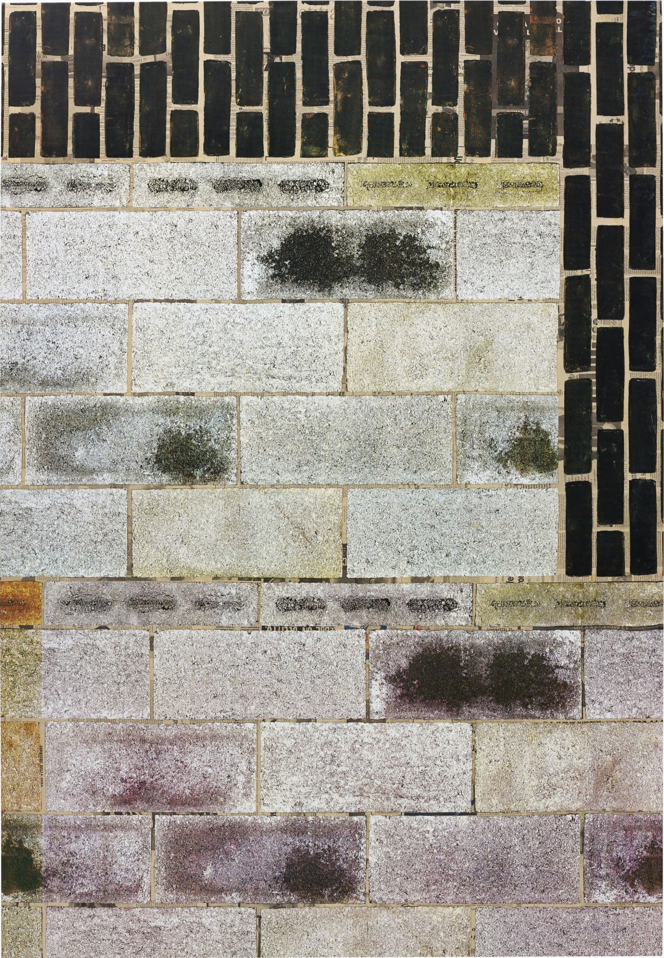 The artist describes his celebrated brick paintings as possessing a 'depth of actual architectural space', while expressing a 'confused, digitally displaced logic.' Amidst the gridded surfaces of the work exists an ode to the brick and mortar urban landscape of New York, where Walker resides, and his own brick studio windows. The flatness of the canvas and overall 'wall' image is defied by the lurid tones of the white bricks, in addition to the flecks of colour, completed by an almost looming shroud of smaller black bricks. In essence, Walker highlights the power of recycling and re-appropriation as legitimate aesthetic techniques in their own right, but also, in their power, through the staging and re-staging of objects, to inform past, present and future histories.