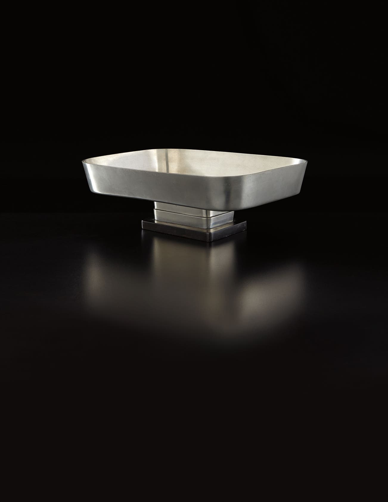 During the late 1920s many American manufacturers began to explore modernist styles. One of these was the California firm Porter Blanchard, with whom KEM Weber collaborated. The resulting objects in pewter are some of the most prized works by the iconic American designer. The present lot is one of two known examples of this rare model; the other was sold at Sotheby's New York in June 2010. Shortly after its conception the centerpiece was illustrated in The Studio, where it is shown on a dining suite by Grand Rapids Furniture Company. The consecutive parallel lines and mechanical aspect of the form are typical motifs used by progressive American designers of the interwar years, representative of the popular streamlined aesthetic of “Machine Age" modernism. The inverted ziggurat form of the base relates to a flower bowl attributed to Weber and dated circa 1930 in the collection of the Yale University Art Gallery (illustrated John Stuart Gordon, A Modern World: American Design from the Yale University Art Gallery, 1920-1950, New Haven, 2011, p. 174, cat. no. 113).