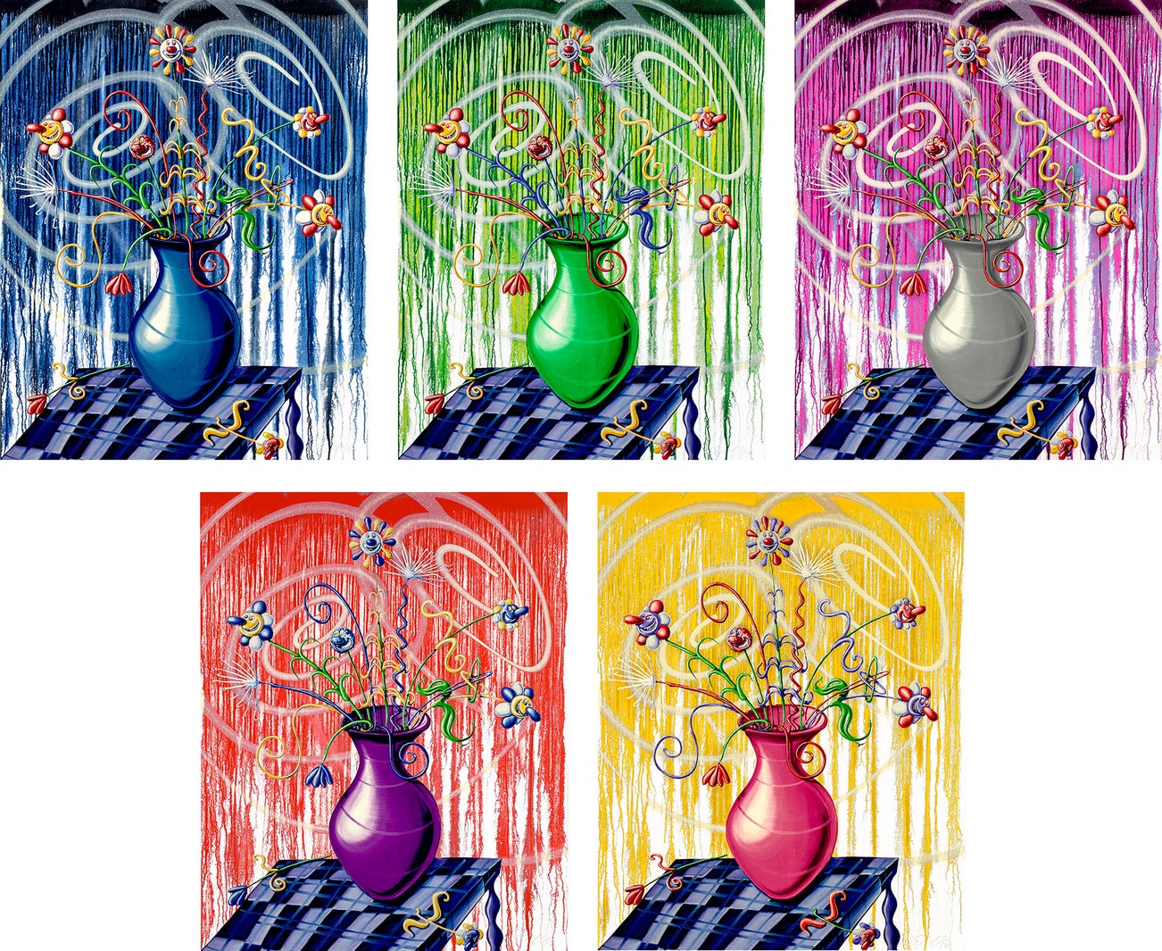 The complete set of five archival pigment prints with screenprinted high gloss varnish and diamond dust in colors, on Innova Etching cotton fine art paper, the full sheets.