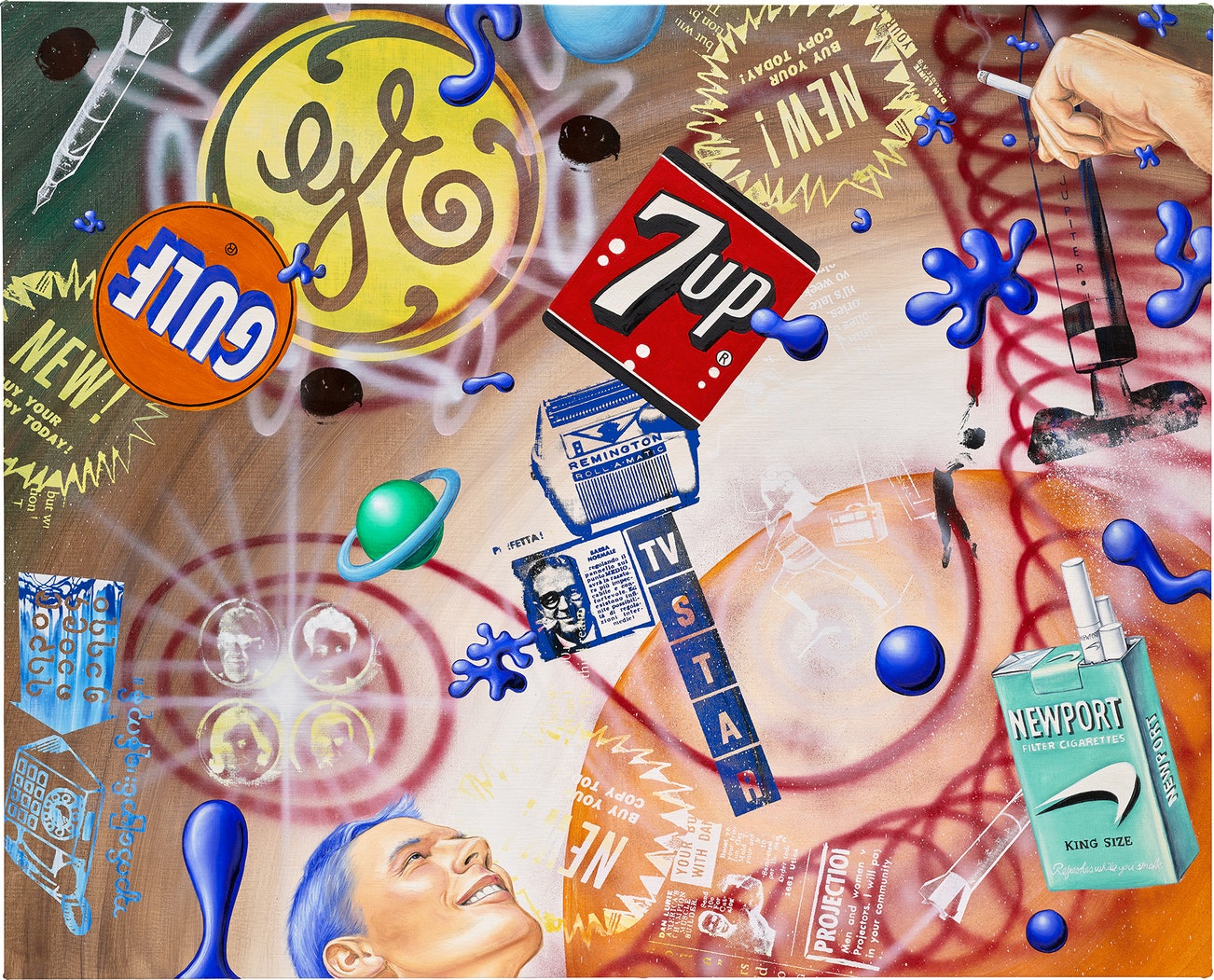 oil, acrylic, spray paint & silkscreen ink and oil on linen, in artist's frame