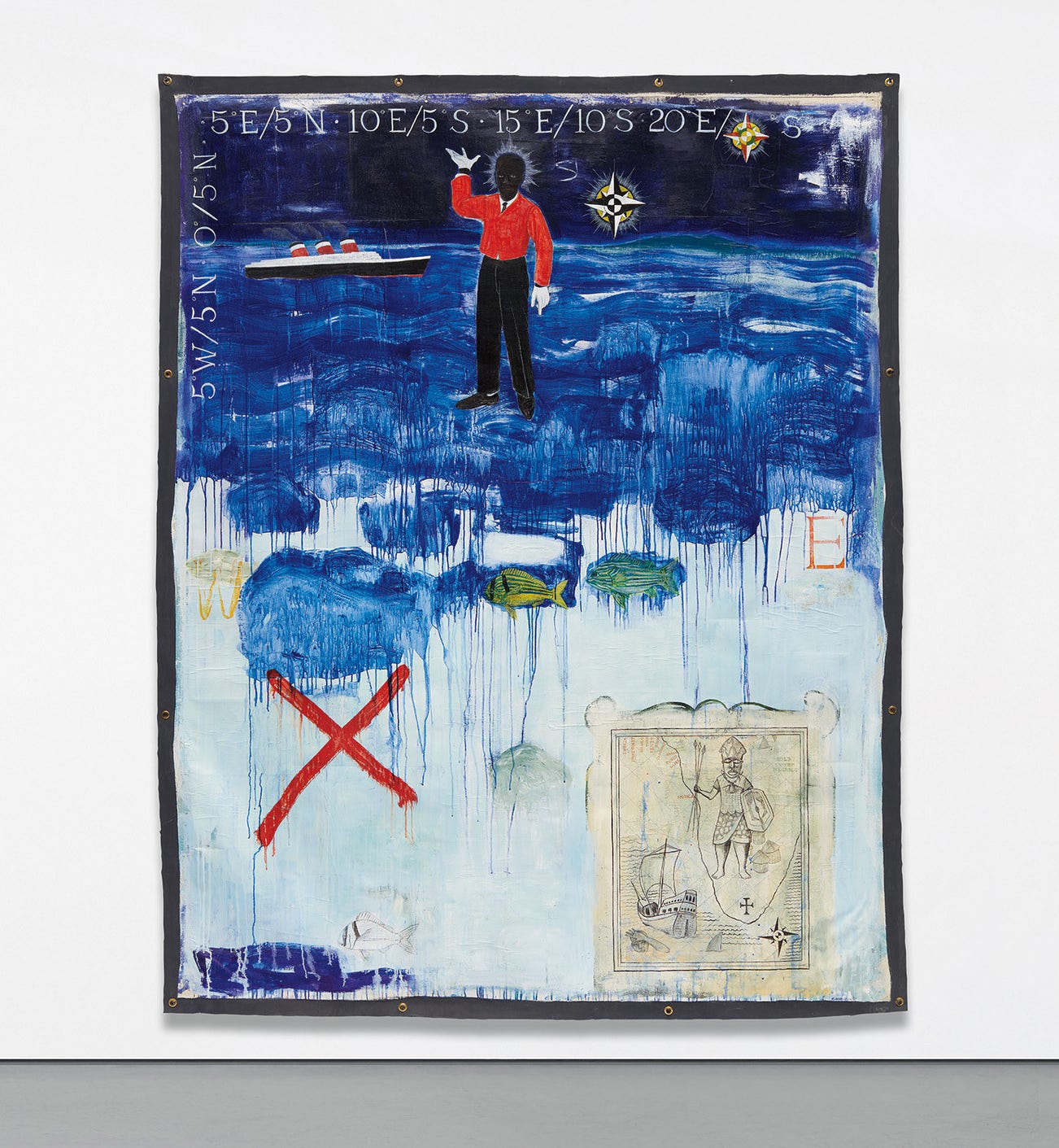 Terra Incognita ambivalently probes how this imbalance of power and struggle for recognition unfolds over time. In Marshall’s painterly composition, the warrior’s dominance of the land is a distant memory. The specific West and Central African countries previously labelled in the map now float like abstract signifiers around the composition in the form of geographic coordinates, heightening the notion of the sea as the very locale of the black diaspora. The figure’s traditional waiter attire and the presence of the ocean liner – a mid-19th century invention used for intercontinental travel rendered obsolete after World War II – conjure a not too distant past when African Americans were granted freedom on paper, yet were at social, political and economic disadvantage. “When black people were introduced into the Western world,” Marshall emphasized, “they arrived with no independent agency, institutions or economies that would put them in a competitive relationship with the market-driven milieu they were folded into. Because of this imbalance of power, the struggle for equality and recognition has always been our primary challenge” (Kerry James Marshall, quoted in Kerry James Marshall, New York, 2017, p. 38).