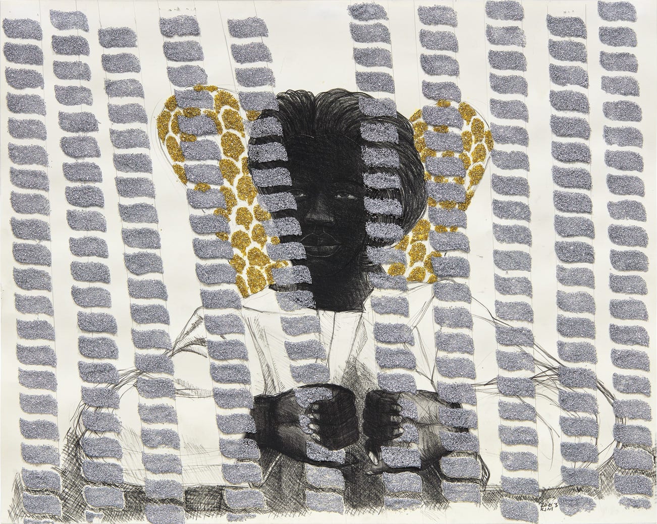 In Kerry James Marshall’s Untitled, 2003, an exquisitely rendered black angel solemnly draws closed a shimmering, silver curtain, symbolically concluding an end to the 1960s Civil Rights Movement. Glistening with a profound spirituality, the present work features the same figure from Marshall’s seminal large-scale painting executed the same year, Memento #5—the final work in the artist’s Souvenir series, which is housed in the permanent collection of the Nelson-Atkins Museum of Art, Kansas City and was recently included in the artist’s celebrated mid-career survey, Kerry James Marshall: Mastry, 2016-17. Honoring a decade of peaceful civil disobedience, courageous acts of protest, monumental strides in legislation, and tragic deaths, Untitled is a powerful elegy to a decade of triumph for the African American community, and the country at large.