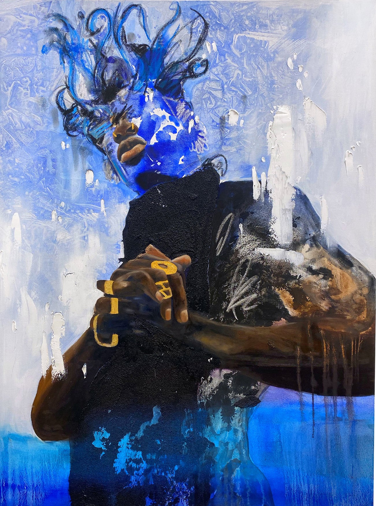 Moonlit King is exemplary of Khari Turner’s paintings, which primarily focus on portraits of black figures with exaggerated features and accessories. Here a black figure is viewed from below, identifiable only through his nose, lips and embellished hands. As a typical in Turner’s work, an interest mark-making and representation is combined with strong socio-political concern – the artist aims to highlight a duality of the black experience. Staged confidently and powerfully, the figure in Moonlit King celebrates the black body, while Turner also acutely highlights various facial and bodily features that have been negatively stereotyped and devalued. Turner notes “that people with wider noses, thicker lips, and darker skin statistically getting longer prison sentences in the US.” (https://www.guyhepner.com/artist/khari-turner/paintings-by-khari-turner/)