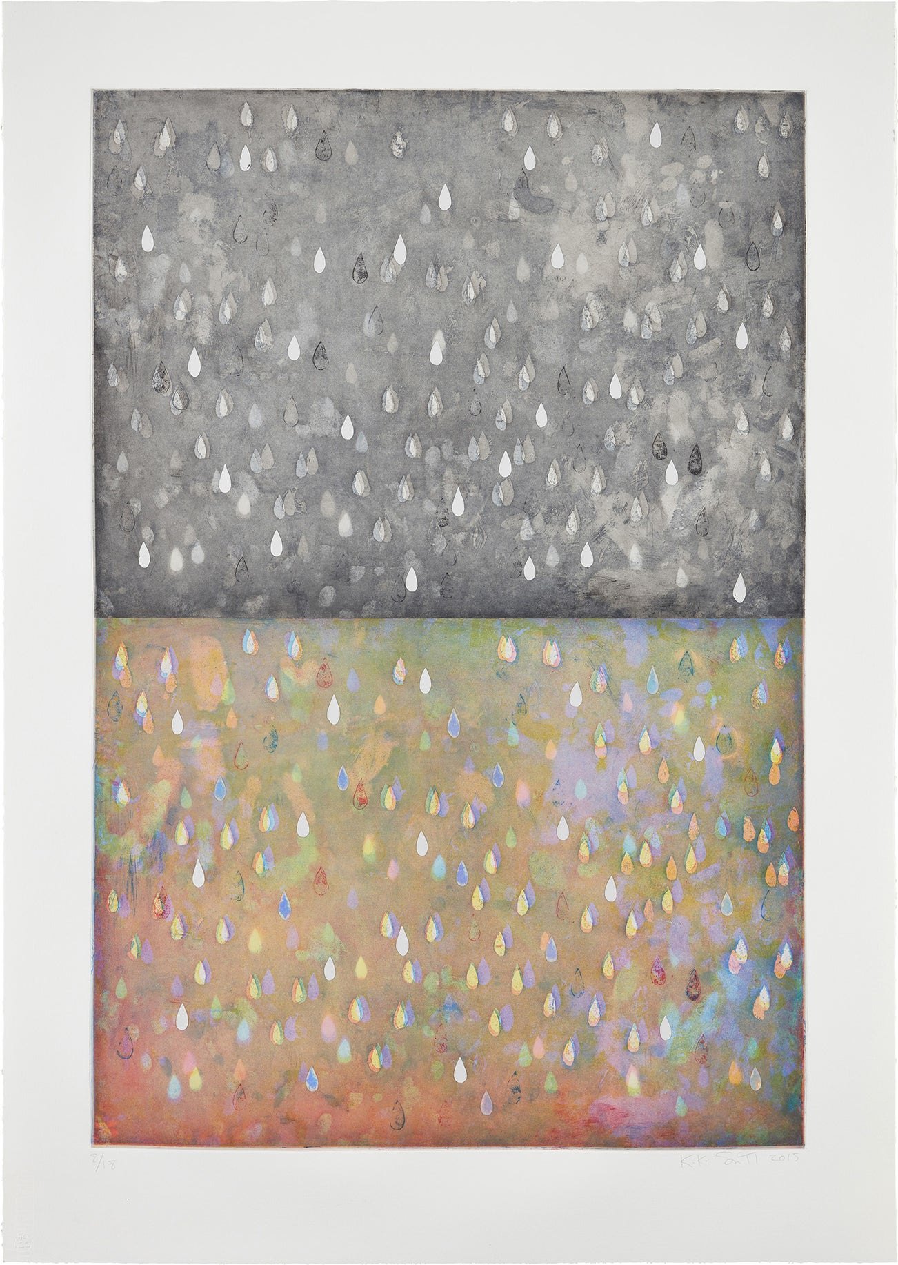 Etching in colors with hologram paper and mirrored mylar collage, on Hahnemühle paper, with full margins.