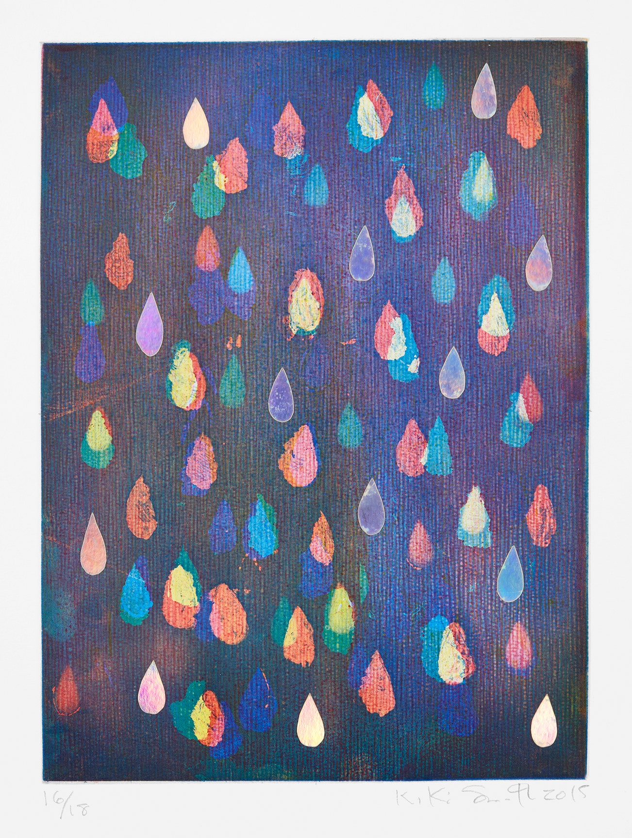 Etching in colors with hologram paper and mirrored mylar collage, on Hahnemühle paper, with full margins.