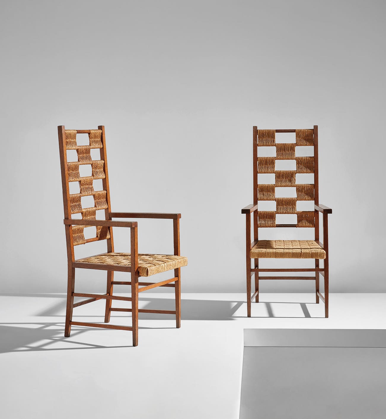 A year after the Austrian professor and artist Koloman Moser designed the present model armchairs, The Studio magazine extolled his work, writing: “When the history of modern art in Vienna comes to be written in detail, the historian will start at the Secession; and when he comes to personalities it will be found that in one branch—namely, applied art—no one is worthier of a prominent place than Koloman Moser, for in the space of a few years he has created a school and (what is more) has helped to educate not only his pupils but also a public as eager to learn as they, and manufacturers ready to produce things which are artistic besides being useful.” Though the author was specifically referring to Moser’s role in co-founding the groundbreaking Wiener Werkstätte in 1903, a defense for this praise can still be found in the present lot: the chairs not only unite the artistic with the useful but they also exemplify the ways in which design was used to influence public taste at the turn-of-the-century in Vienna.