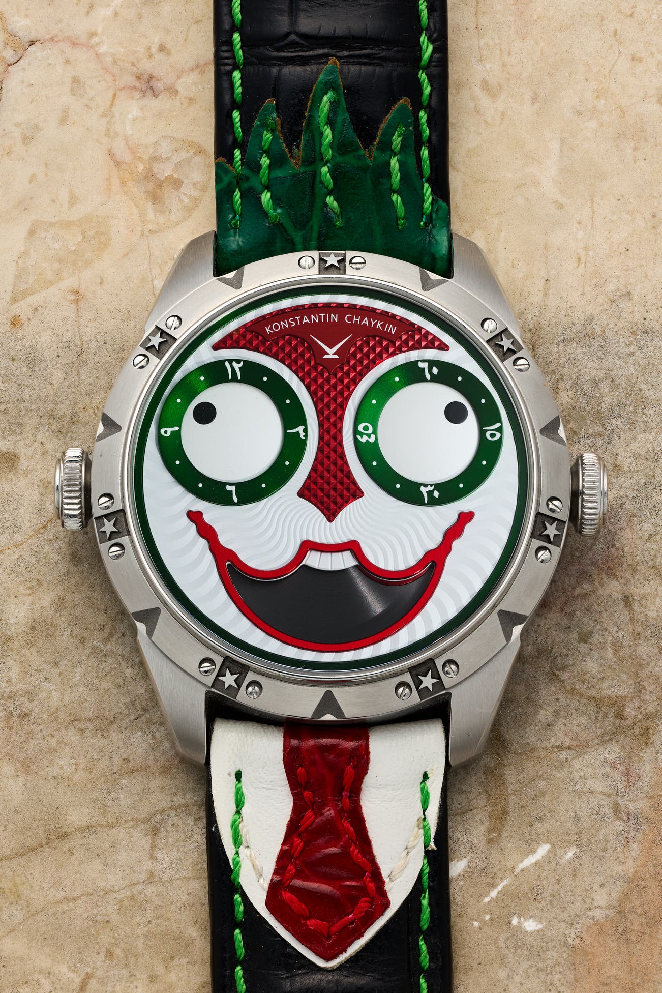 • Introduced at Baselworld in 2017, the now highly recognizable “Joker” wristwatch by Konstantin Chaykin was a significant departure from his previous, more somber creations. The present Joker Dubai Edition celebrates the 50th anniversary of the United Arab Emirates with a guilloché dial with the colors of the UAE national flag. The “eyes” indicate the hour and minutes in eastern Arabic numerals, while the “tongue” represents the phases of the moon. The caseback is engraved with the UAE “Year of Fiftieth” logo. The present watch is in near new condition and accompanied by it warranty and presentation box.