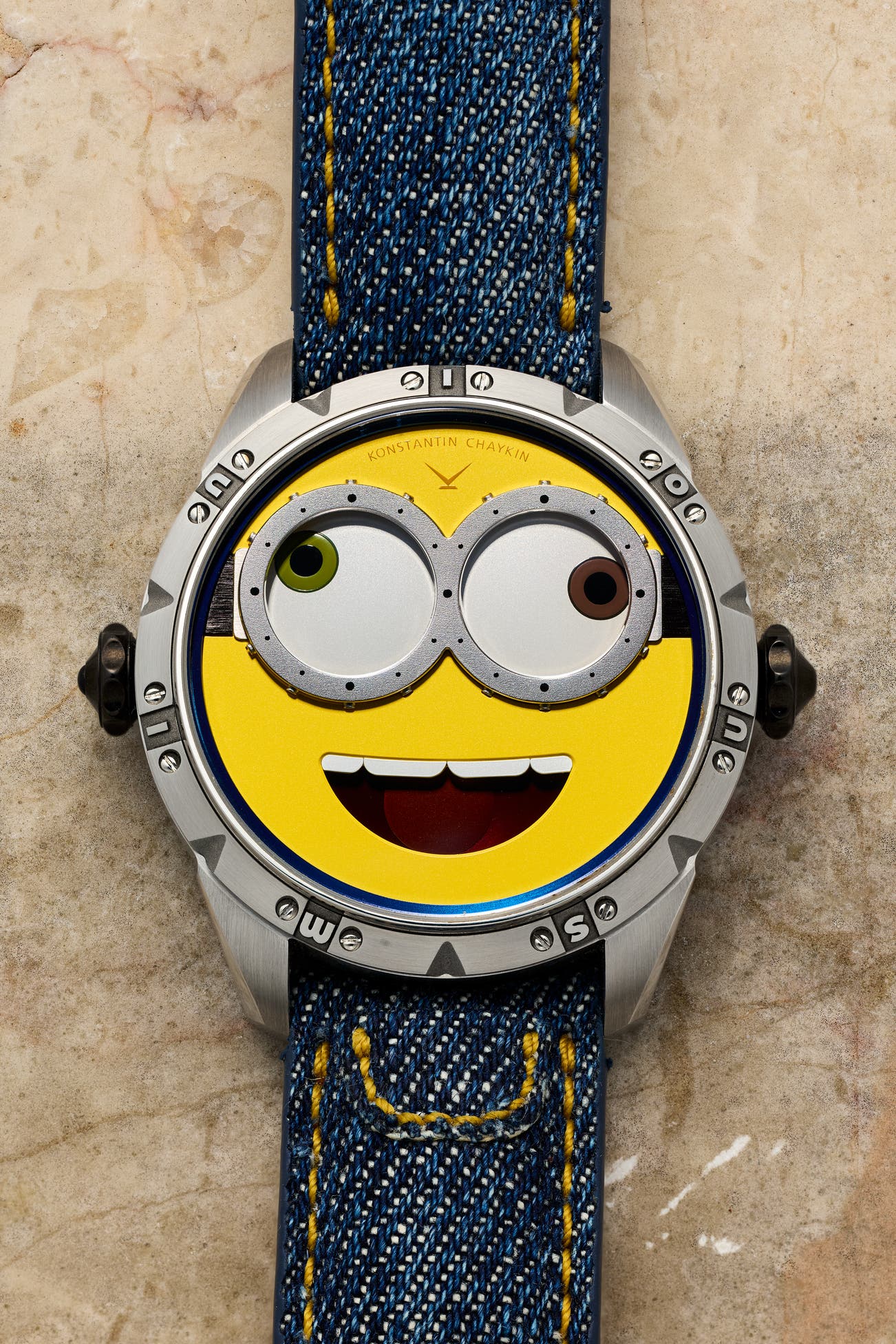 • While not the main stars of the movie, the Minions, small yellow creatures that are biologically compelled to seek out and serve villainous characters, serve the main character Gru (voiced by Steve Carrell). Chaykin’s horological representation of a Minion features one green and one brown eye. Only one Minion possesses heterochromia, thus, all of Chaykins Minion Wristmons are in fact, images of Bob. They wear denim jumpsuits and metal goggles, also represented in the watch.