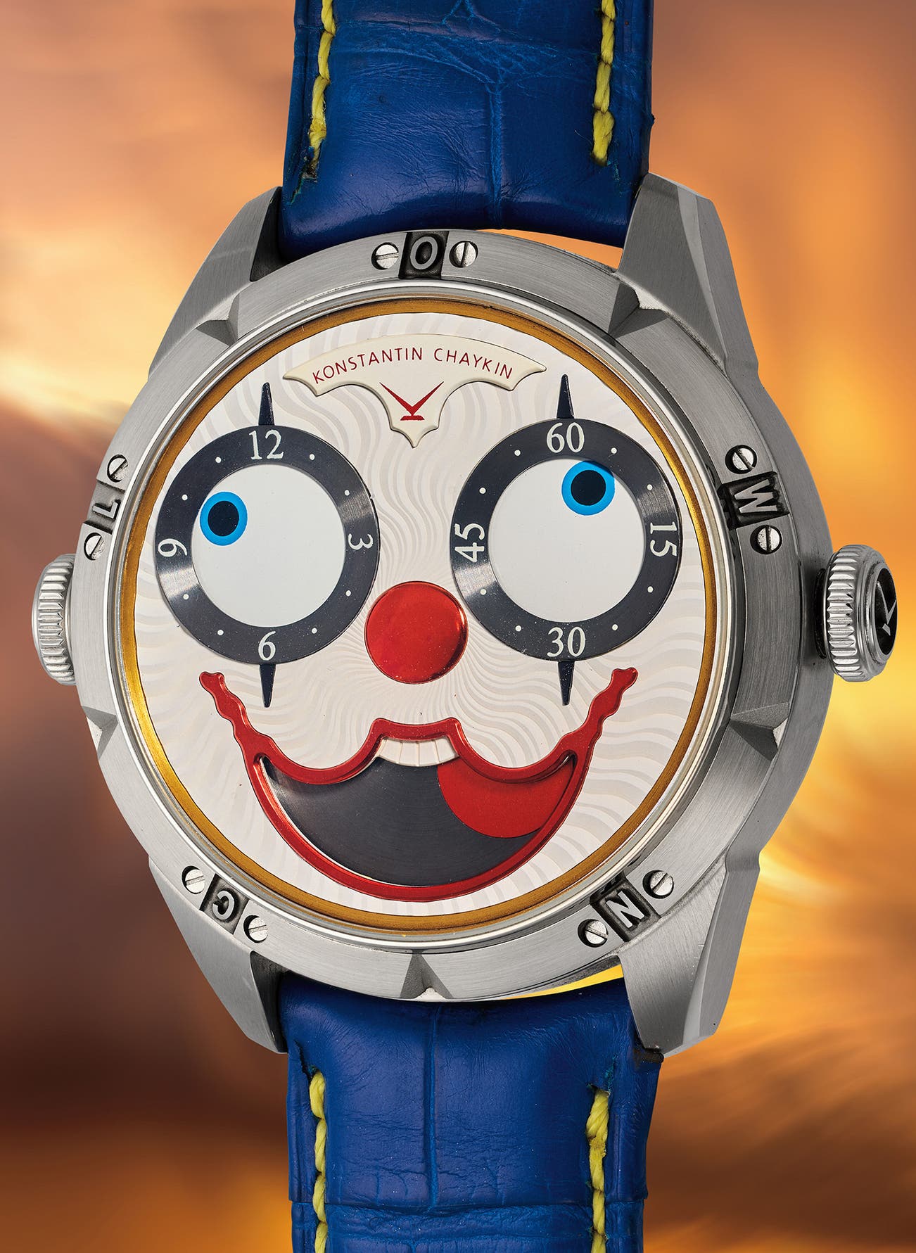 Most recognizable for its signature dancing-pupils indicating the hour and minutes and the peculiar grin under the big red nose that displays a moon phase cleverly disguised as the tongue of the entertainer. Painted with a decoration of white guilloché spiralling out from the center, the moonphase can be advanced with the pusher sitting adjacent to the crown. Produced in stainless steel with a 42m diameter case, the clown is dressed in a flamboyant costume in blue and red with yellow stitching as its strap.