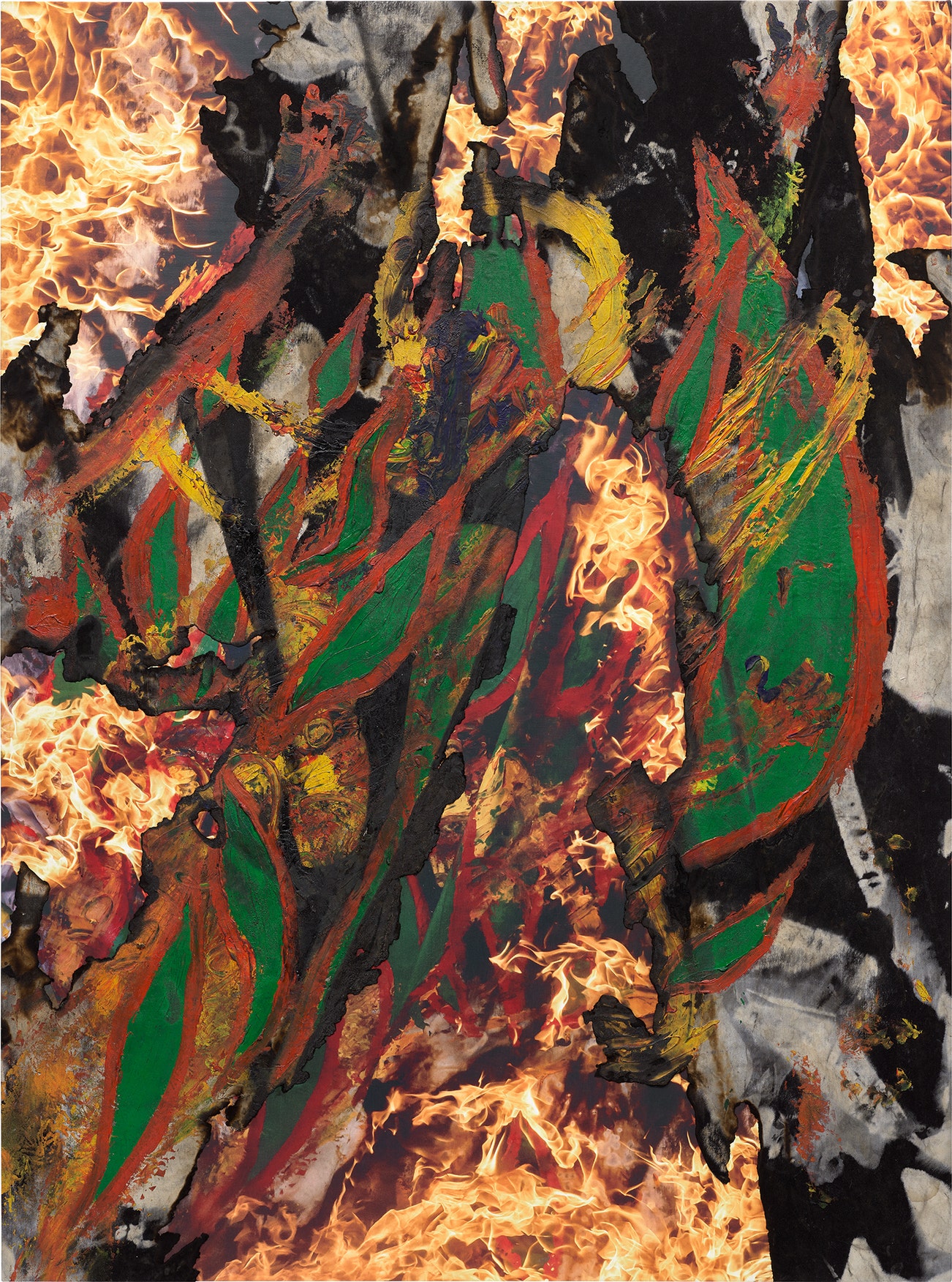 inkjet print on canvas, gel medium, bleached denim and acrylic paint
