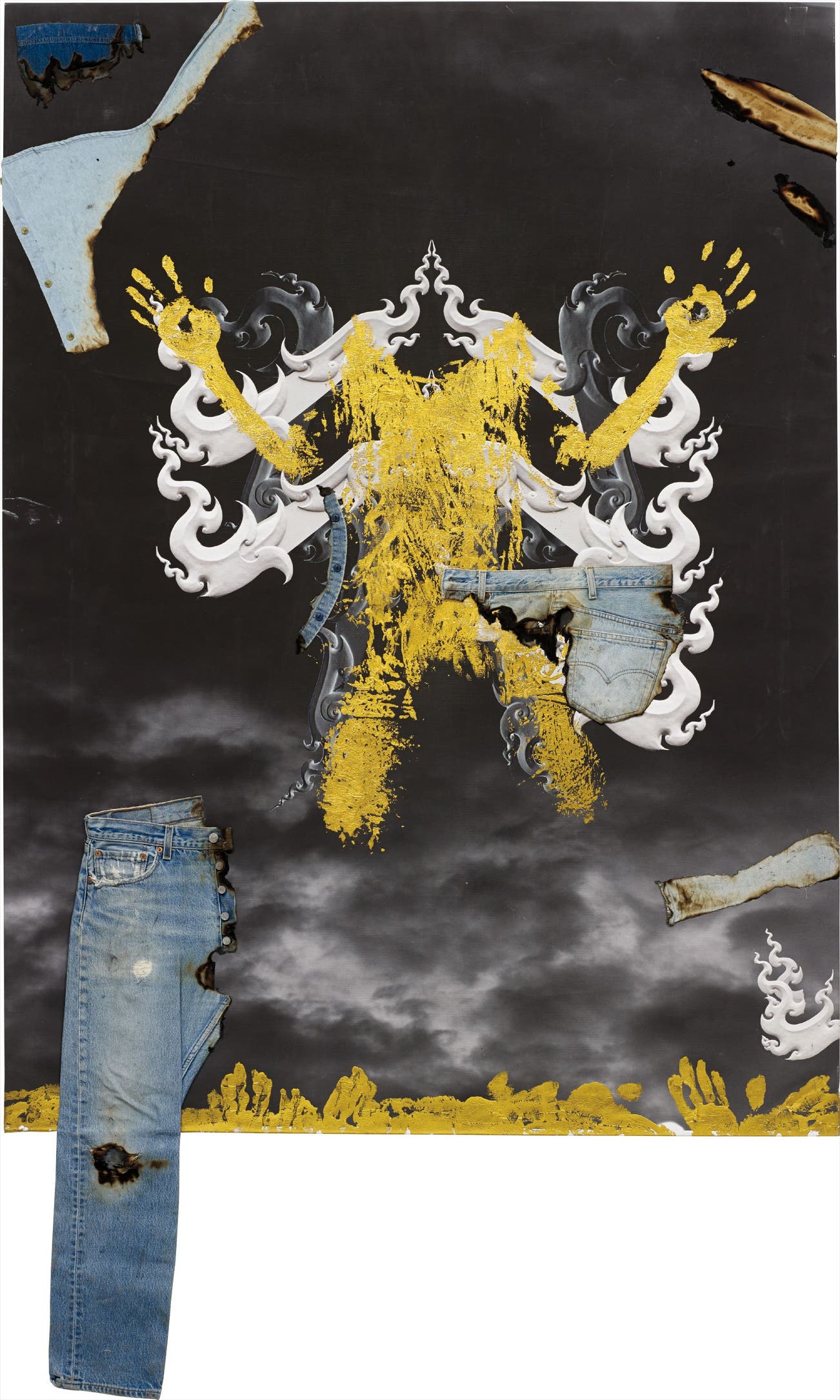 denim on digital printed canvas with foil stamping