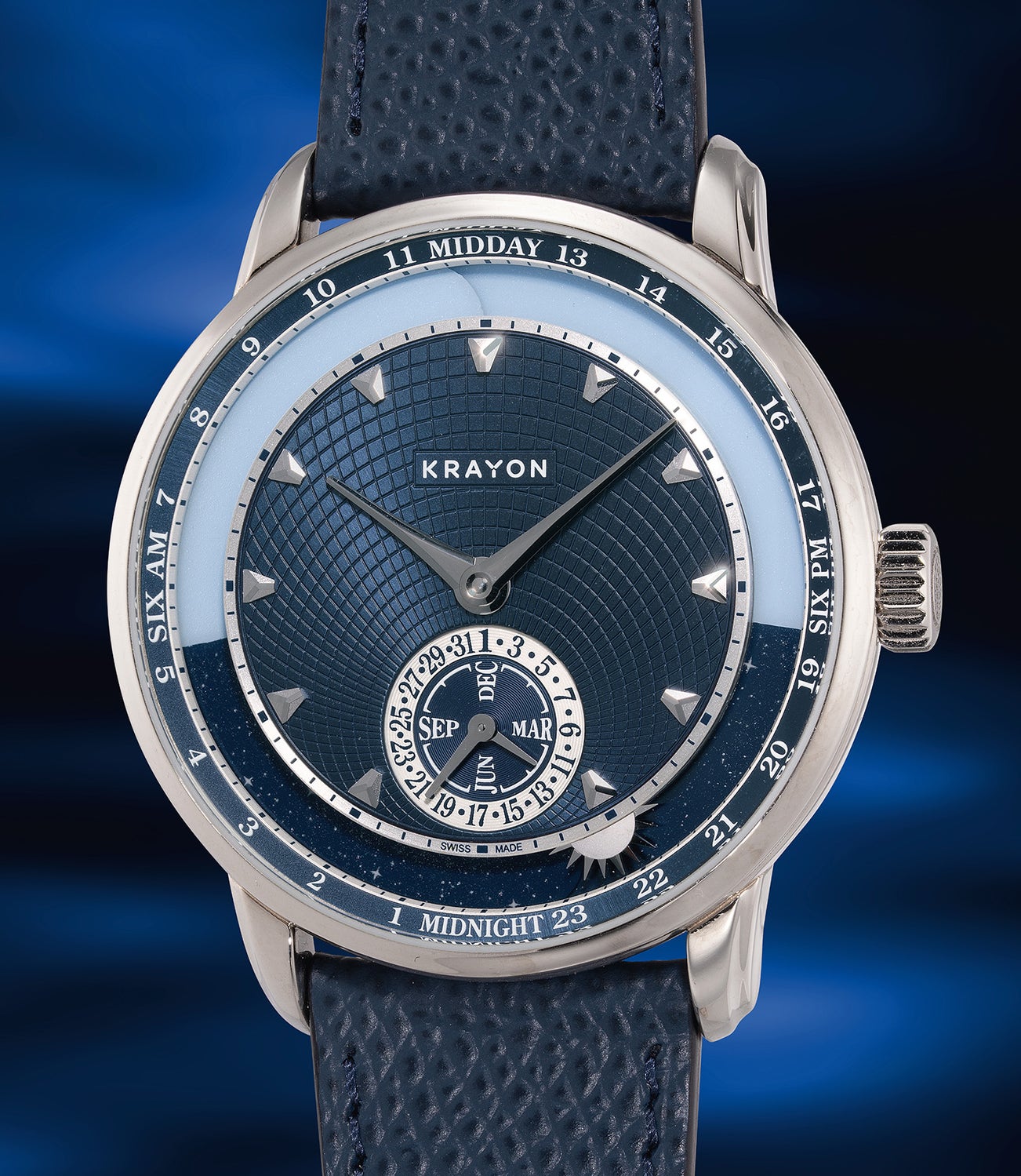 Emerging from the legacy of Krayon's groundbreaking Everywhere, the Anywhere represents a masterclass in distilling astronomical complexity into elegant horology. This white gold manifestation transforms celestial mechanics into wrist-worn poetry, where the dance of sunlight across latitudes becomes visible through an exquisite mechanical ballet. The 39mm diameter case, with its slender profile and concave bezel, demonstrates Krayon's commitment to ergonomic sophistication. Polished surfaces alternate with delicate fluting along the lugs, creating plays of light that echo the dial's celestial display.