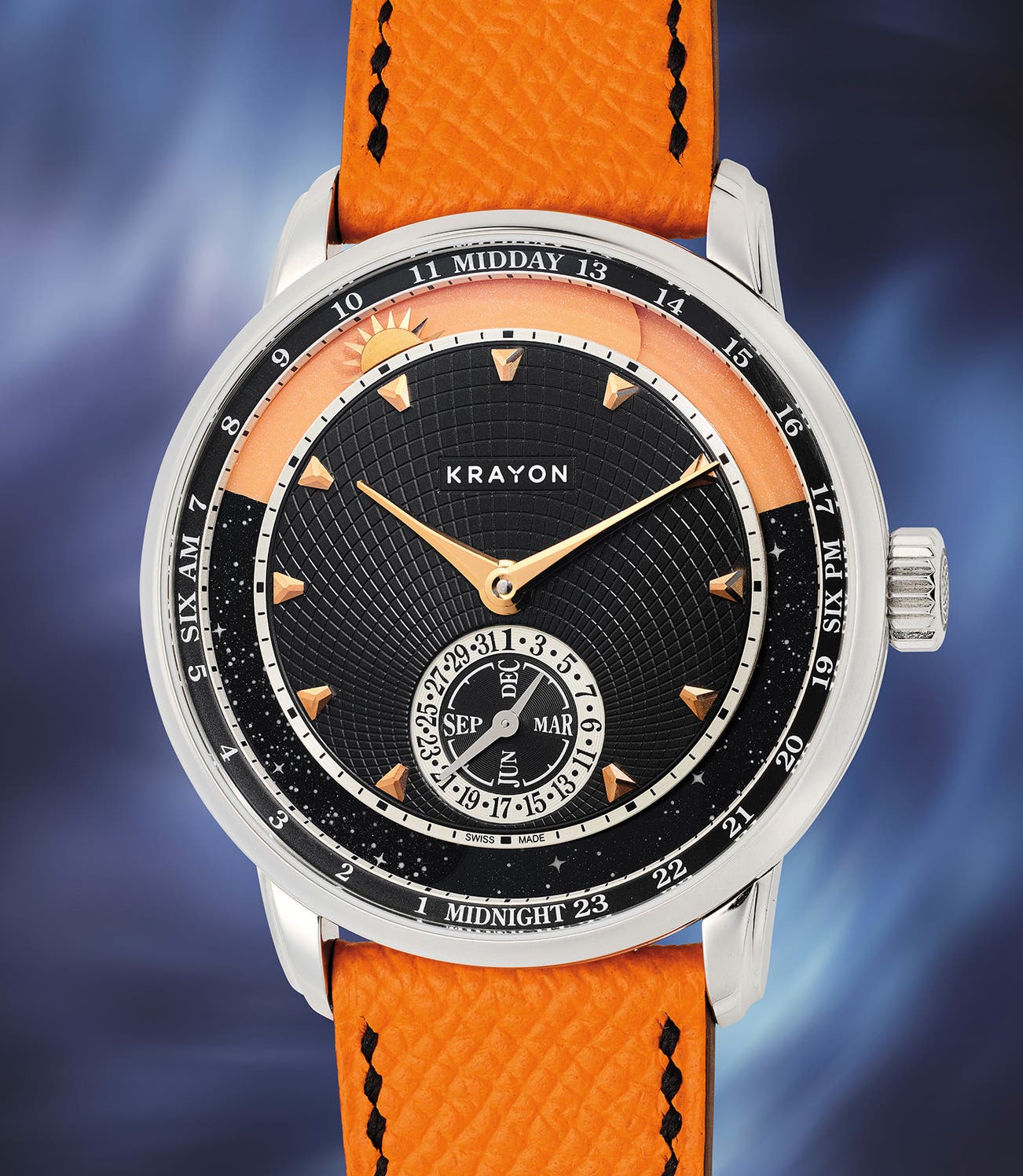 In 2021, Krayon introduced the Anywhere limited edition in collaboration with Dubai-based retailer Perpétuel. With a color scheme “inspired by the mythical desert” as evidenced by the pale, shimmering orange and inky, starry black, it was the first and only Anywhere series produced in stainless steel. Only 15 pieces were made, and of those, has been confirmed by the retailer that this is the only one fitted with Western Arabic numerals. The remainder of the series features Eastern Arabic numerals, as befitting a limited edition made for a Middle Eastern retailer.