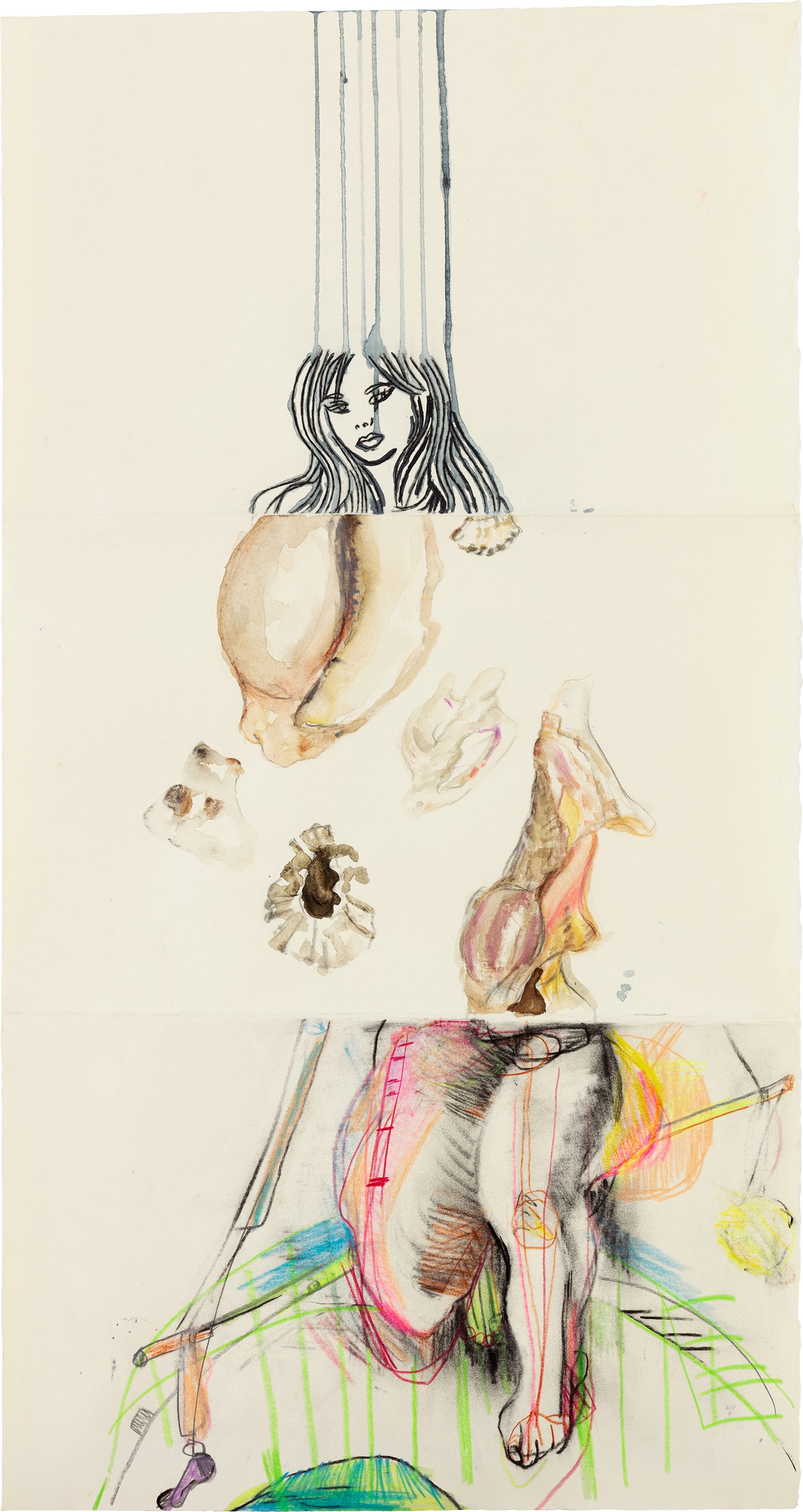 pencil, watercolor, India ink, color charcoal and carbon paper transfer on paper