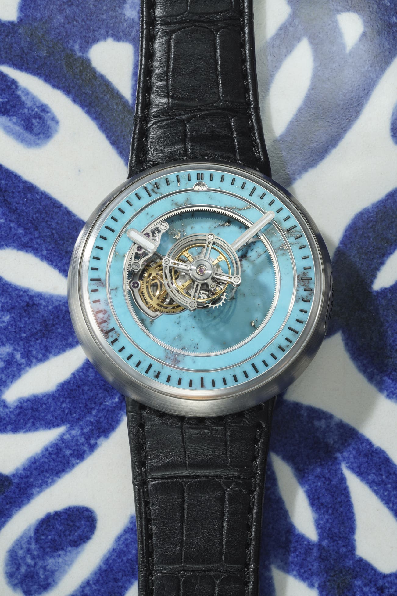 A unique cutting edge and eye catching titanium "floating tourbillon" wristwatch with turquoise spider stone dial with guarantee and box
