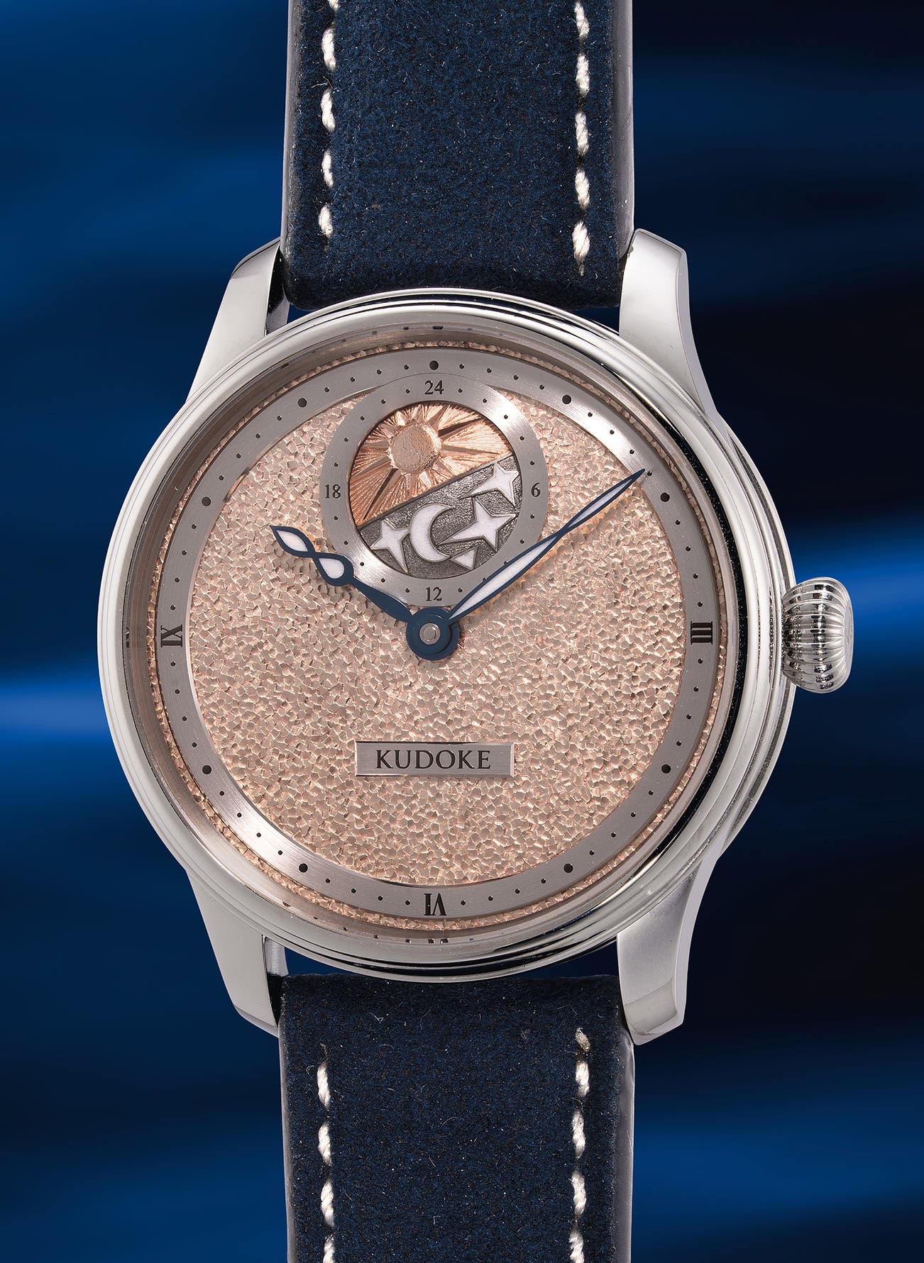 The dial, rendered in champagne rosé, is alive with hundreds of tiny hand‑engraved divots, each one unique, producing a subtle sparkle and texture that is never repeated. At 12 o’clock, the signature day/night indicator is elevated with deep engraving: a rose‑gold plated sun contrasts with a moon and stars motif, the latter treated with blue lume. Kudoke’s elegant infinity‑shaped hands are similarly lumed in green Super‑Luminova for clarity and balance.