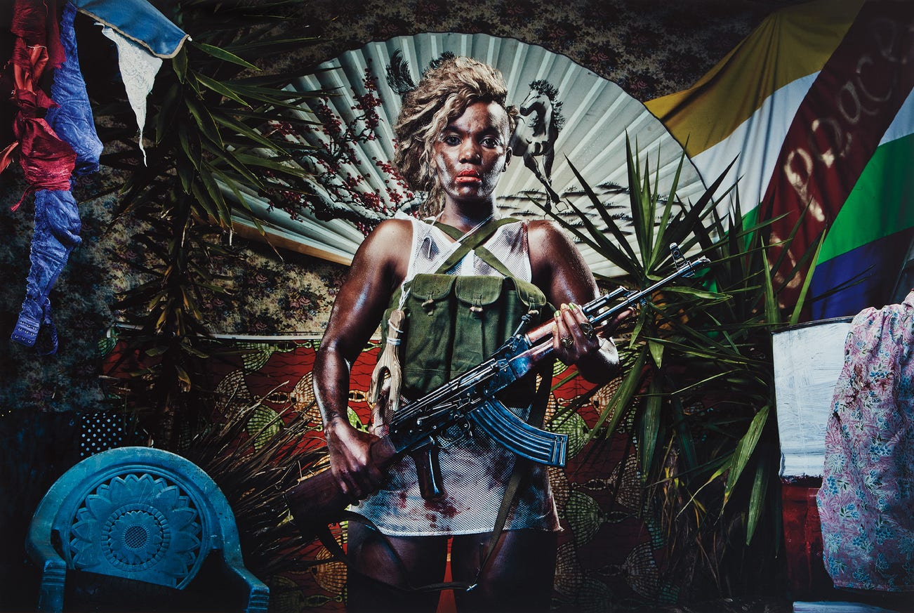 Kudzanai Chiurai‘s multimedia work explores the personal, psychological and social impact of the power structures in place in his native Zimbabwe, as well as the larger region of Southern Africa. Part of his State of the Nation series, Revelations V is an elaborately staged photograph that directly confronts interconnected themes of violence and liberation, as told through a fictionalized depiction of a constructed African state. The title is in reference to the Book of Revelation and its imagining of a future civilization that is only achieved through struggle and persecution. By casting a female in powerful central roles throughout his work, Chiurai upends colonial gender stereotypes, thus highlighting his rebellious nature as both an artist and activist.