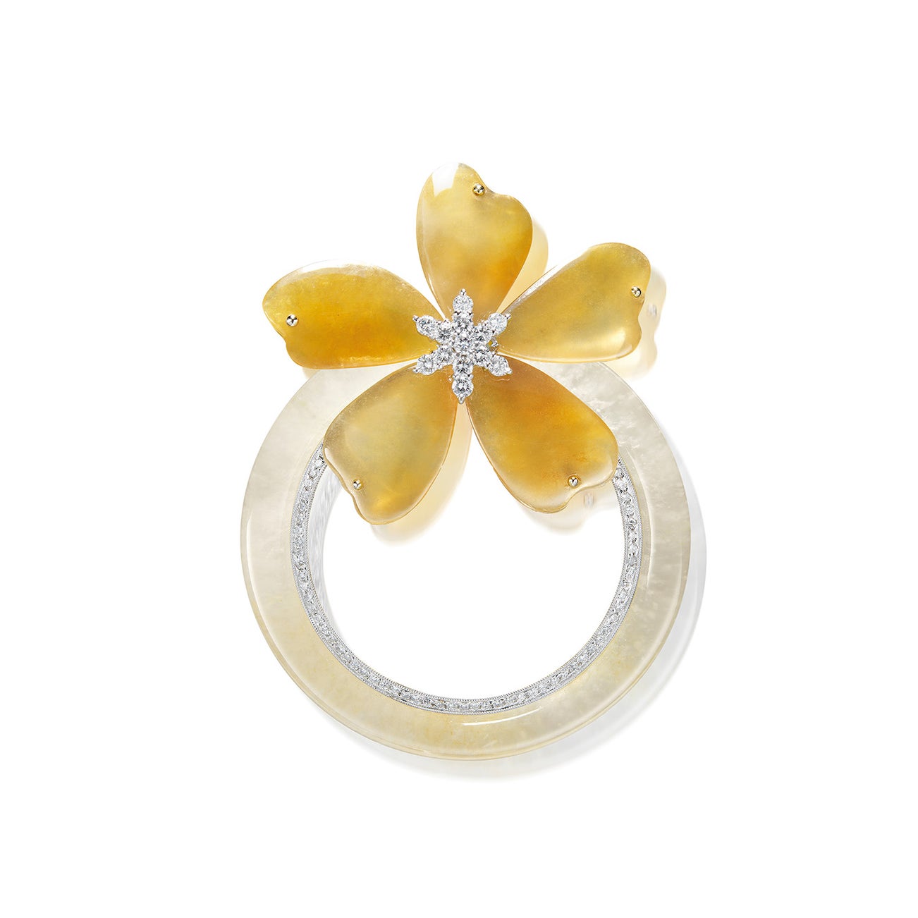 Five carved yellow jadeite petal plaques, with the largest plaque measuring approximately 17.23 x 12.72 mm18K white goldSigned ’98 龔遵慈’<em>Hong Kong Jade & Stone Laboratory Report: (one yellow jadeite petal plaque tested)